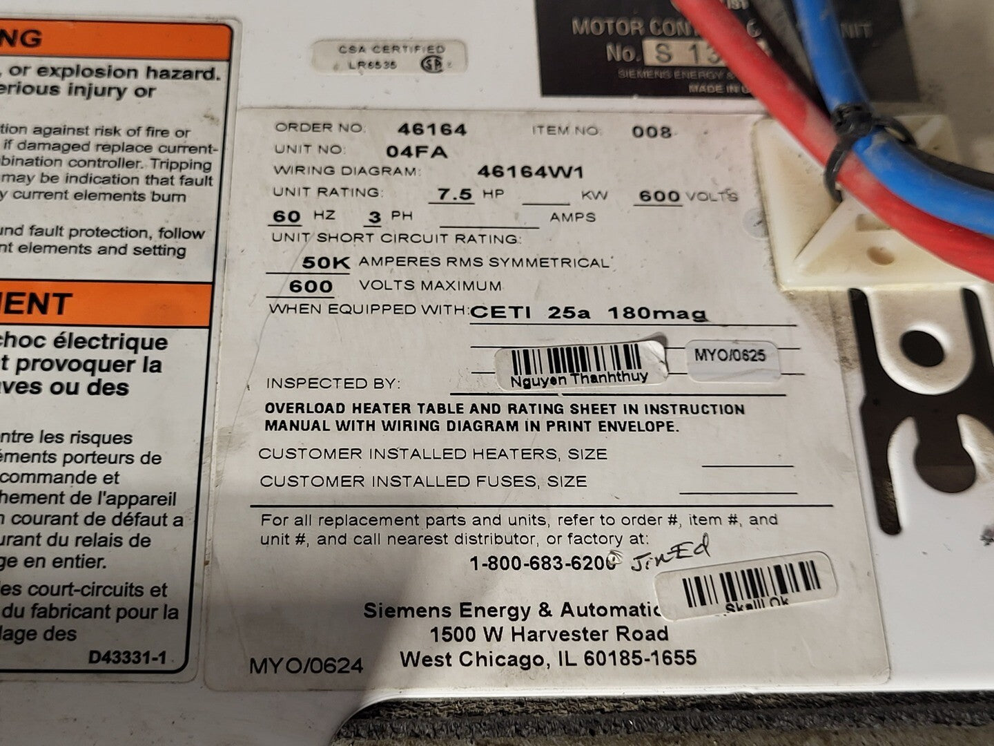 7.5 hp 600V 3-Ph Motor Control Center Bucket 04FA