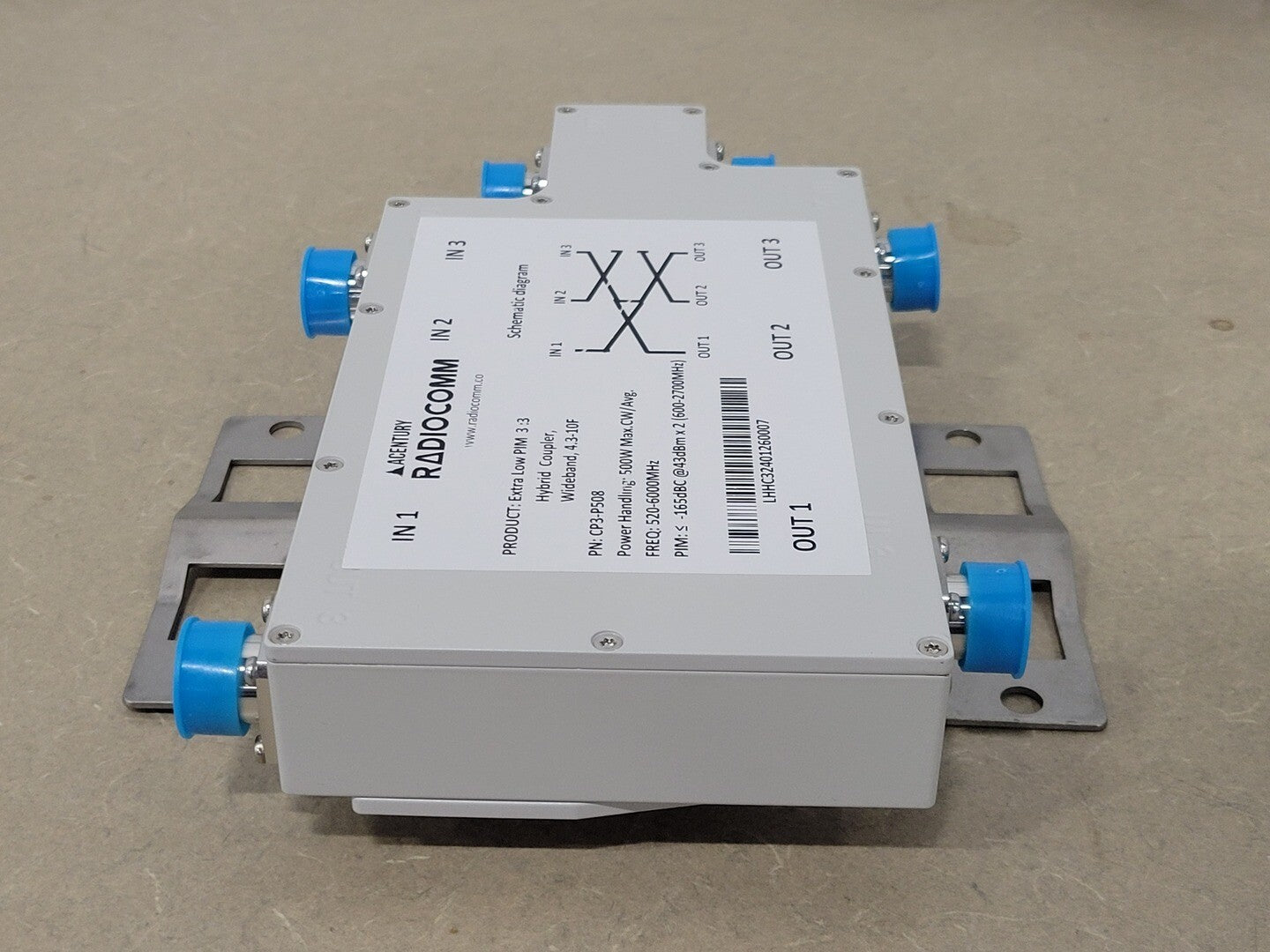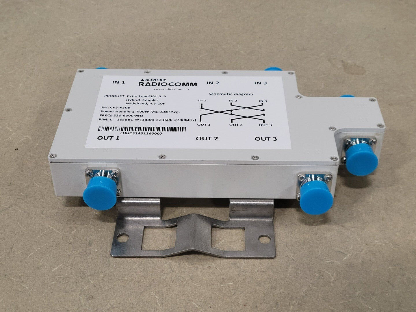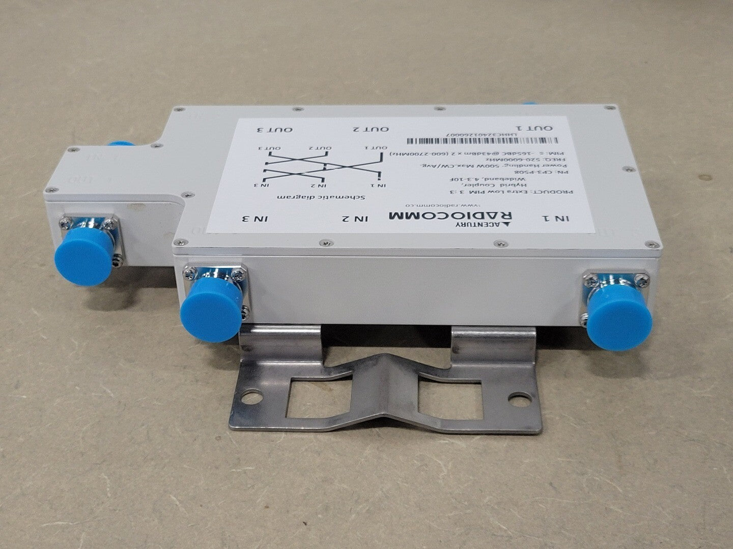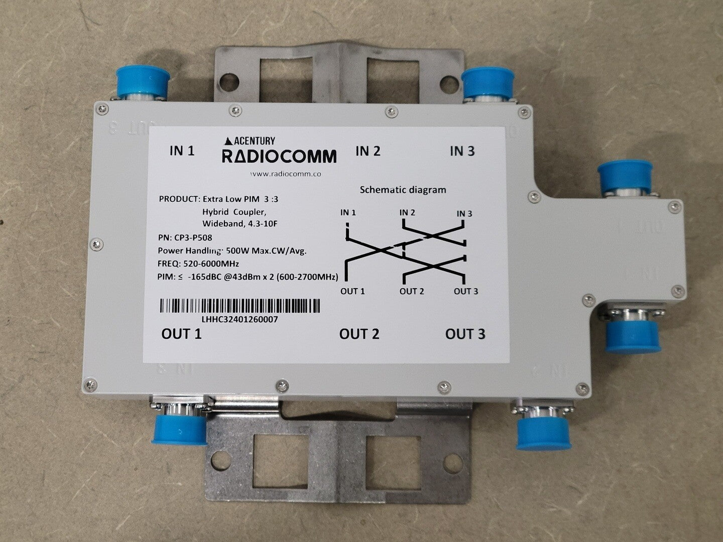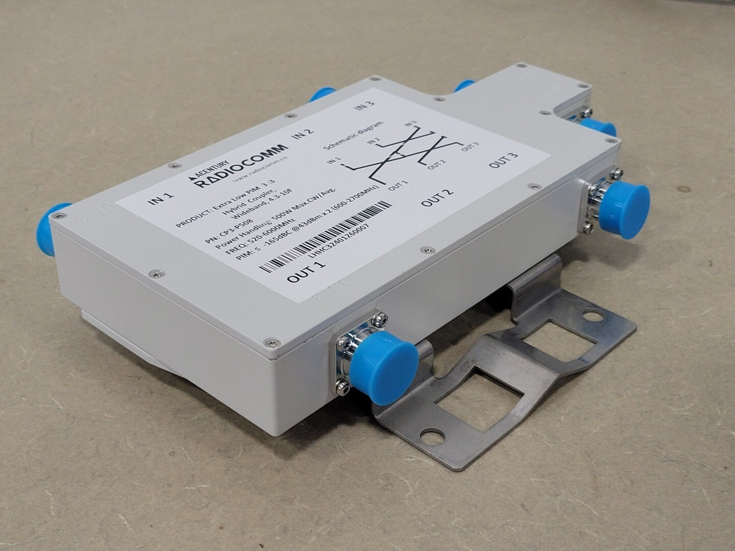 Wideband: 520 - 6000 MHz Intermodulation (IM3): </- -165dBc @ 43 dBm X 4 Input VSWR: </-1.35:1@520-700MHz, </- 1.25:1@700-3800MHz&5120-6000MHz Coupling: 4.8 dB In-band Ripple: +/- 1.0 dB@700-2700MHz, Input Return Loss: 20dB Isolation: >/-22 dB Temperature Range -40 to +65 °C Connector: 4.3-10 Female Application: Indoor/ Outdoor (IP68) Humidity: 0-95% Power Handling (at Input/ High Power Port): 500W CW/Avg. |