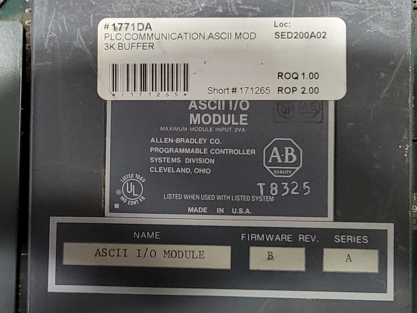 The PLC-5 ASCII I/O Module 1771-DA is a communication module produced by Allen Bradley. It has a rate of communication ranging from 110 to 9600 baud and uses the RS-232-C port protocol. The module has a capacity of 1.5 kilowords or 3 kilobytes per byte. It falls under the Miscellaneous Electrical and Circuit Boards collections. The pricing for this product is $50 with 2 units currently available.