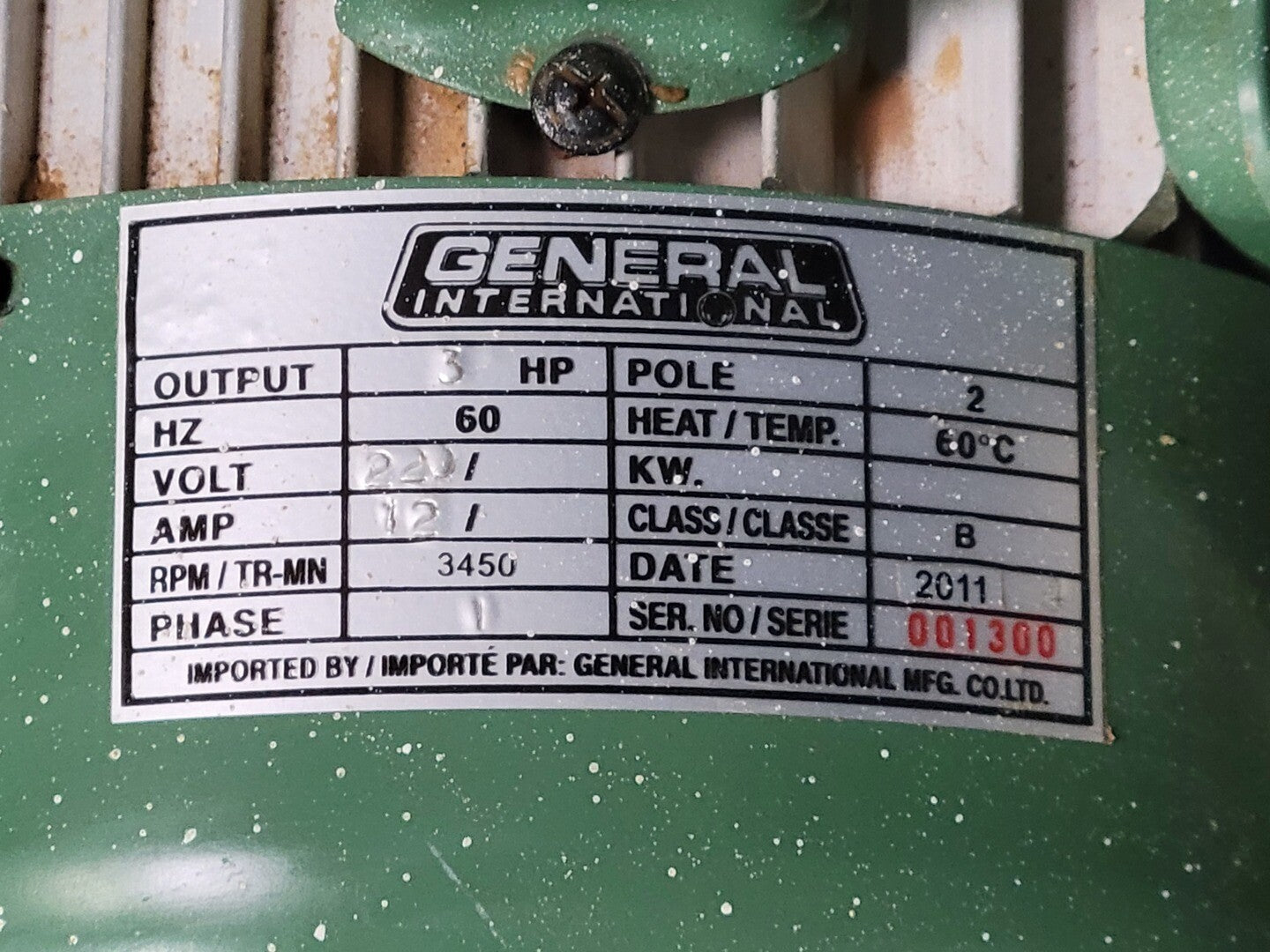 Motor: 3HP, 220V, 12A, Single-Phase, 3450RPM