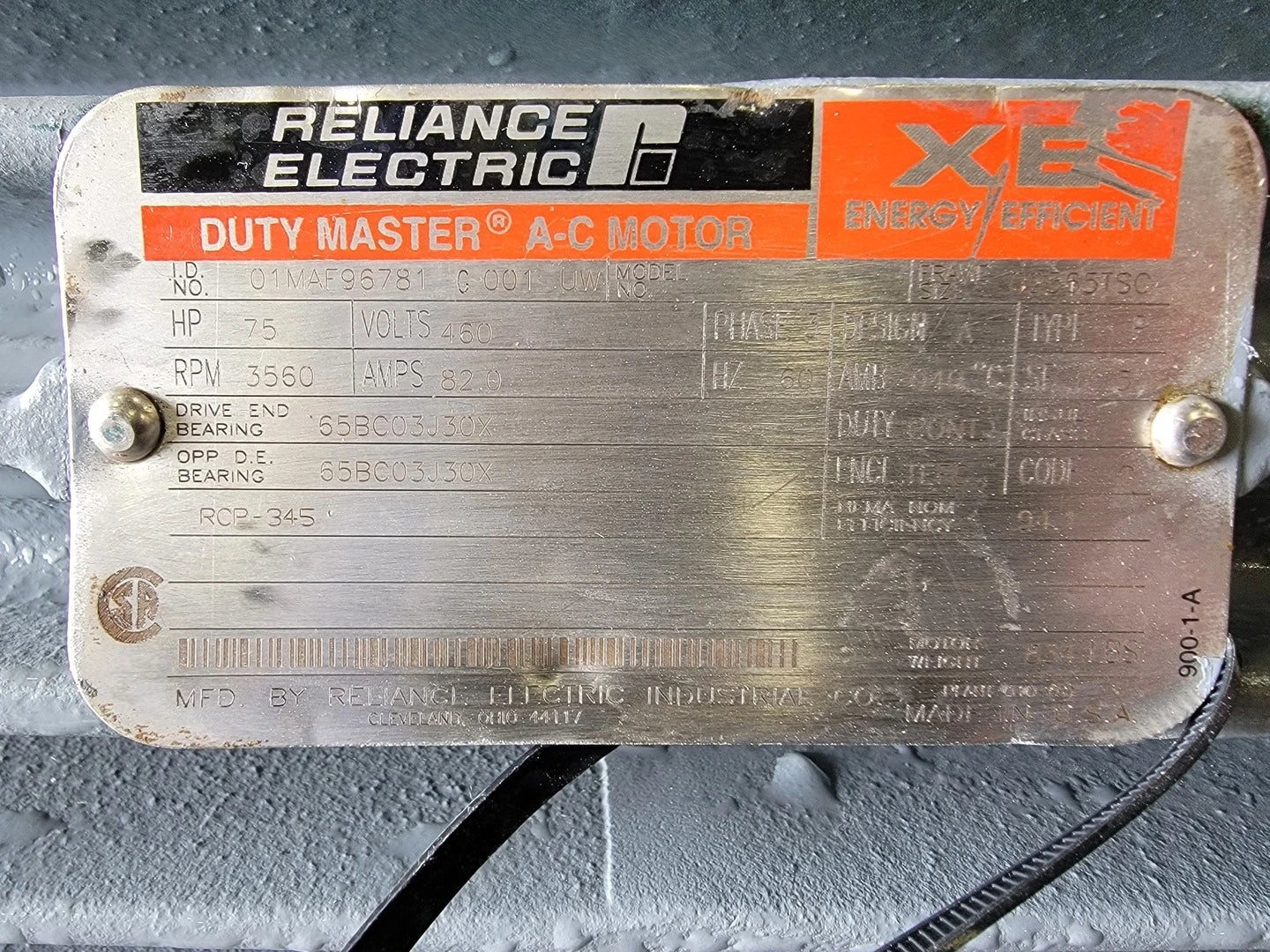 75 hp, 460 volts, 3560 rpm, 365TSC Electric Motor 01MAF96781