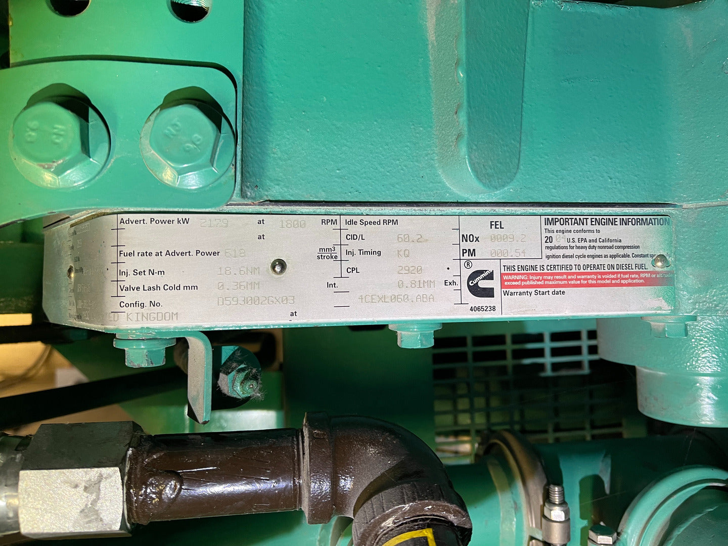 Cummins Engine: QSK60-G6 Rated kW: 1750 kW Power Factor: 0.8 I2 Capability Connection: Wye Battery: 24 VDC Volts: 347/600 V Amps: 2105 A Rotating Speed: 1800 rpm Engine Advertised Power: 2179 kW @ 1800 rpm Fuel Rate at Advertised Power: 618 mm3/stroke Injection Set: 18.6 Nm |