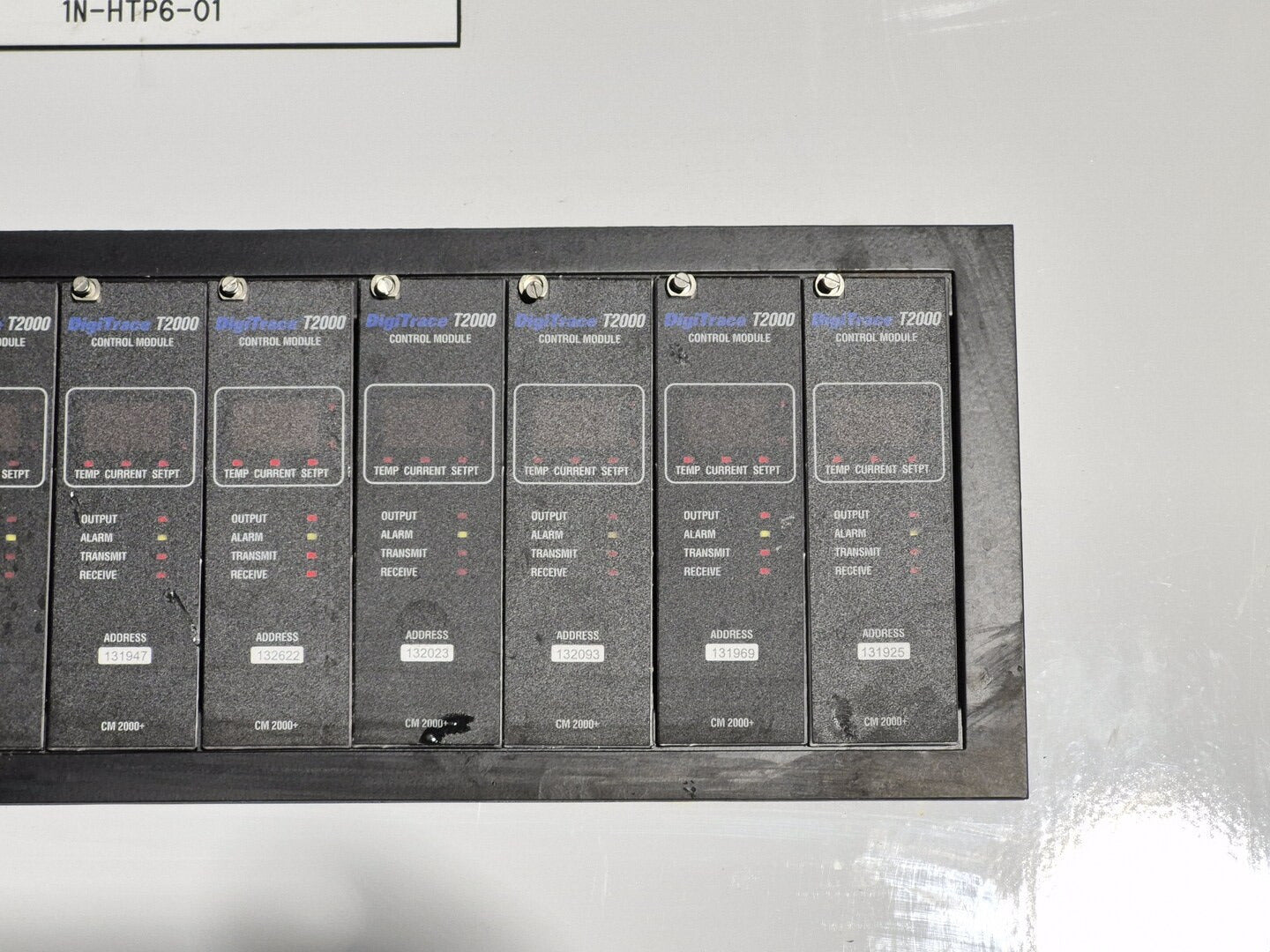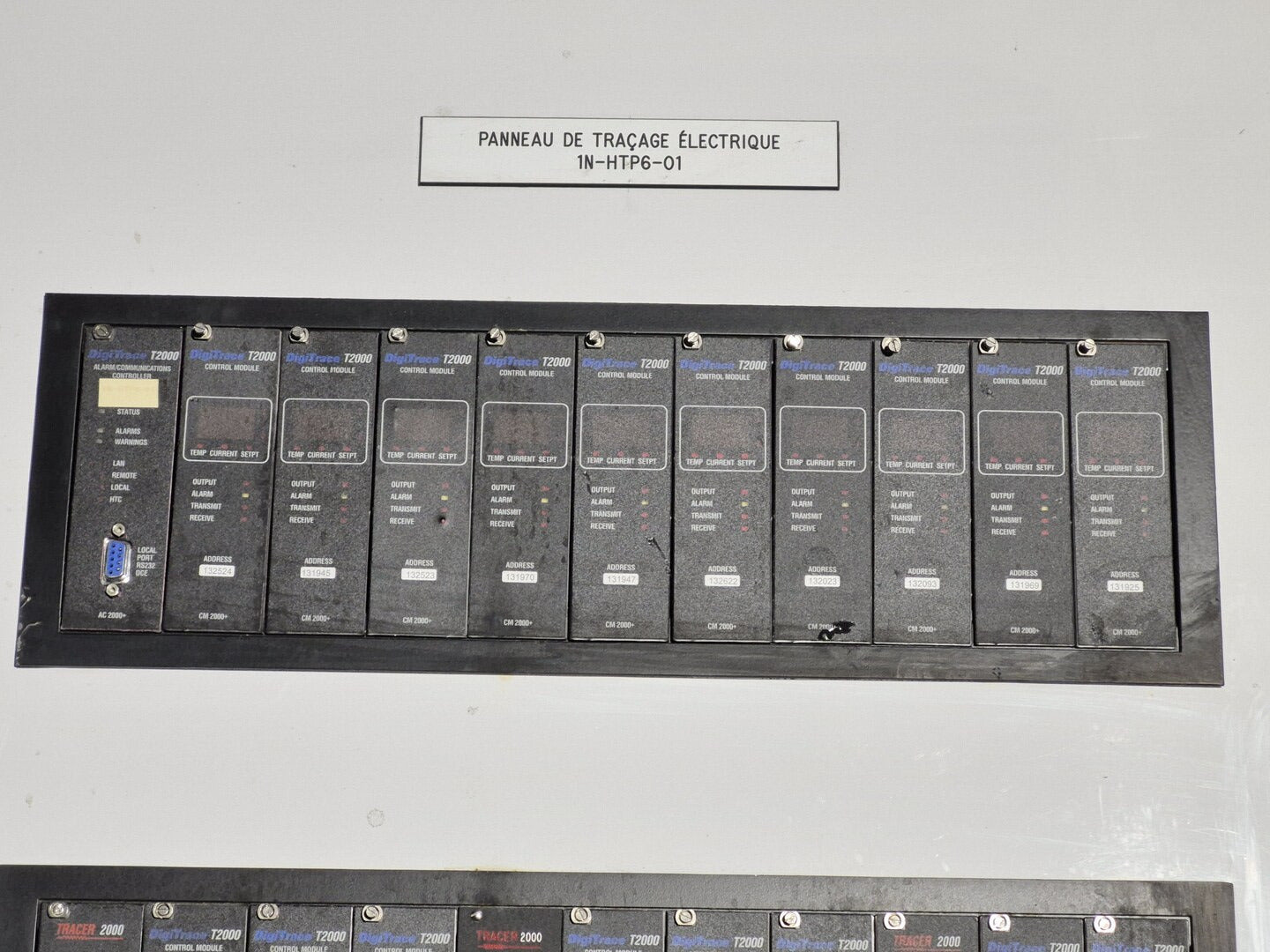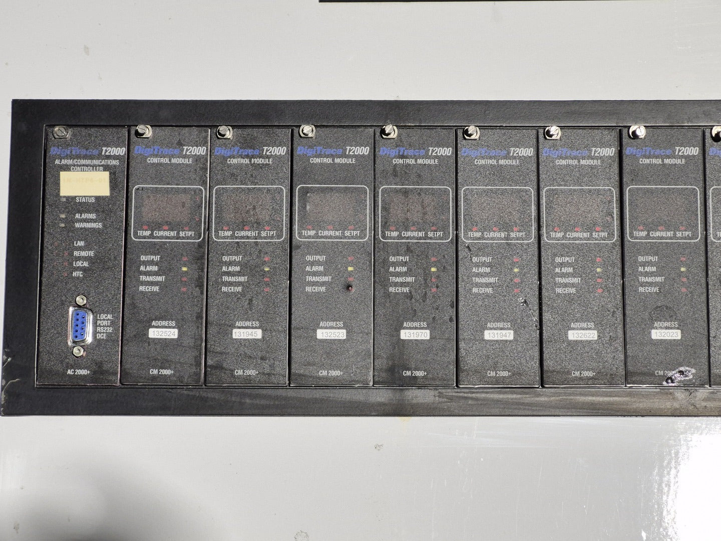 Description: Heat trace controller panel with 28 control modules and 1 alarm/communications module present. All control modules are model CM 2000+, but, some are under different production era branding names. Alarm communications module has model number AC 2000+. CM 2000+ Module Specifications Operating Ambient: -40F to 149F Control Output: 12 VDC nominal, 50 mA max. Sensor Inputs: Two 3-wire 100 ohm platinum RTDs Power Requirements: 120 to 240 VAC nominal, 1-Phase, 5 W max. Temperature Measurement Range: