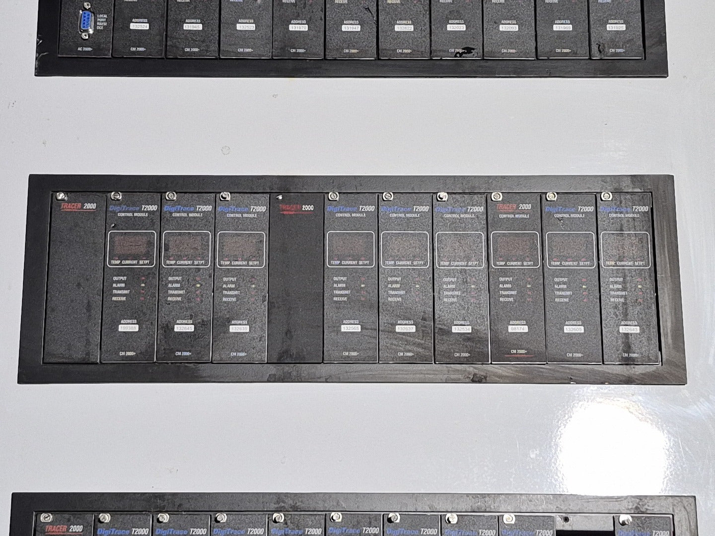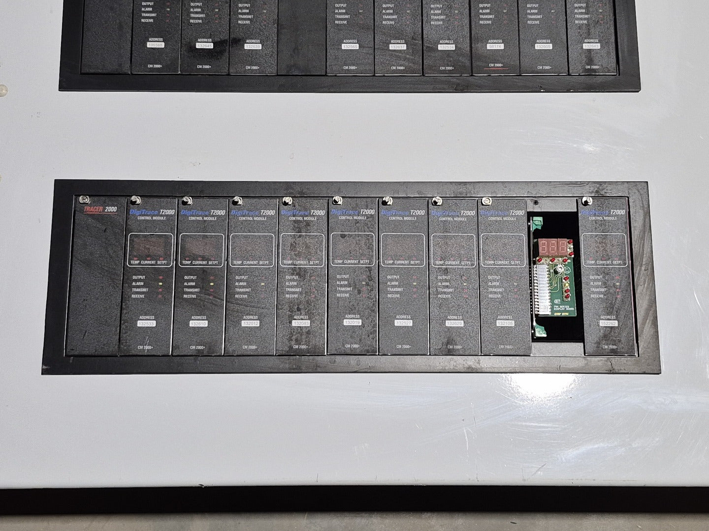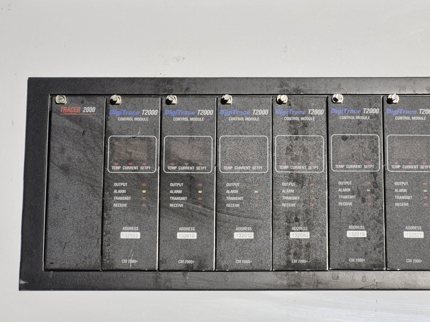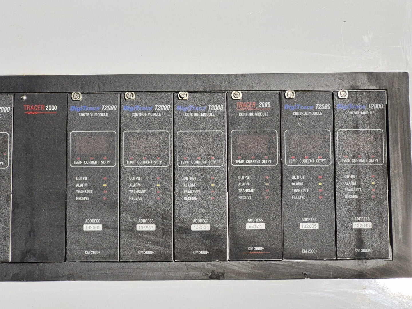 Description: Heat trace controller panel with 28 control modules and 1 alarm/communications module present. All control modules are model CM 2000+, but, some are under different production era branding names. Alarm communications module has model number AC 2000+. CM 2000+ Module Specifications Operating Ambient: -40F to 149F Control Output: 12 VDC nominal, 50 mA max. Sensor Inputs: Two 3-wire 100 ohm platinum RTDs Power Requirements: 120 to 240 VAC nominal, 1-Phase, 5 W max. Temperature Measurement Range: