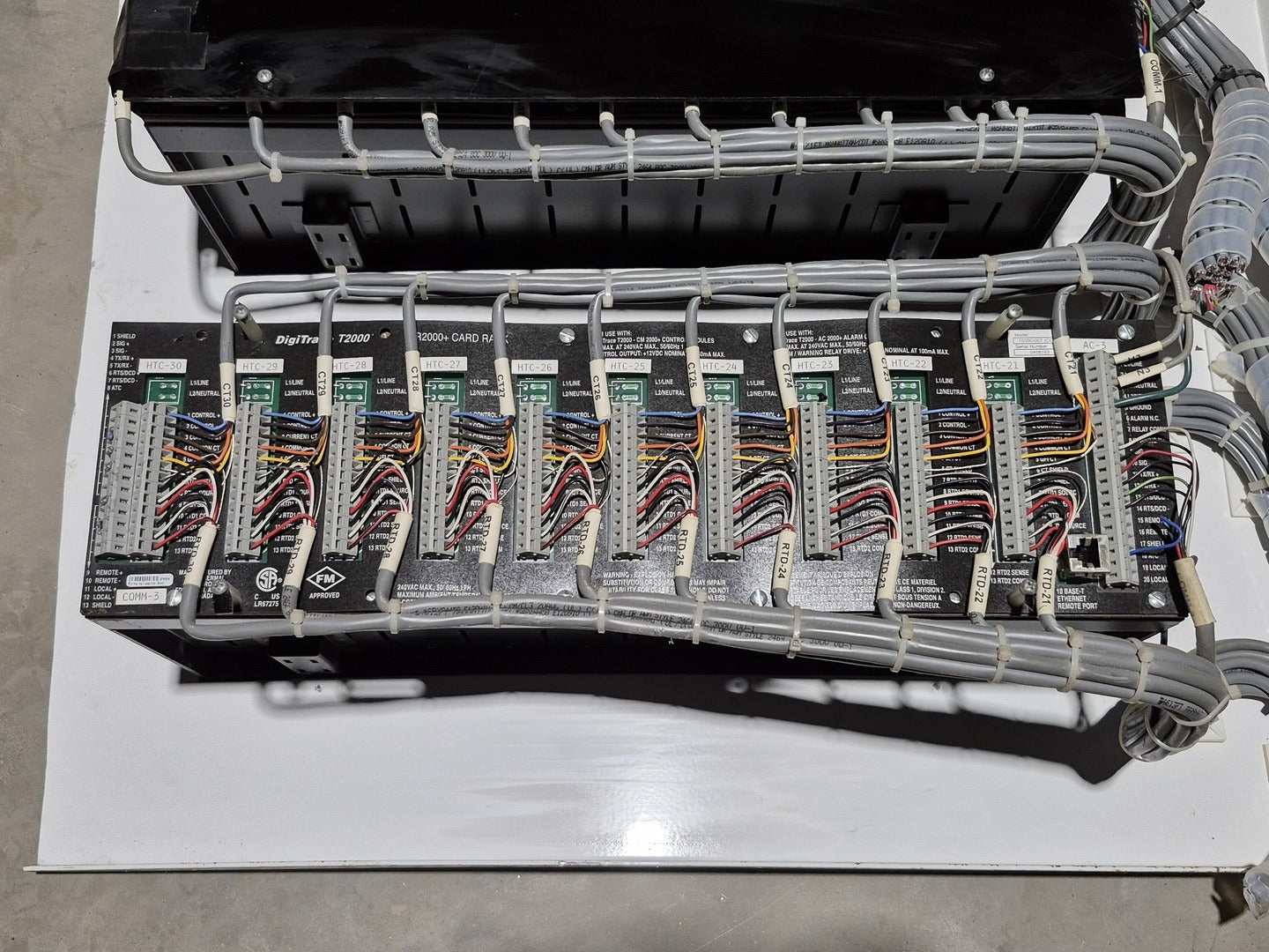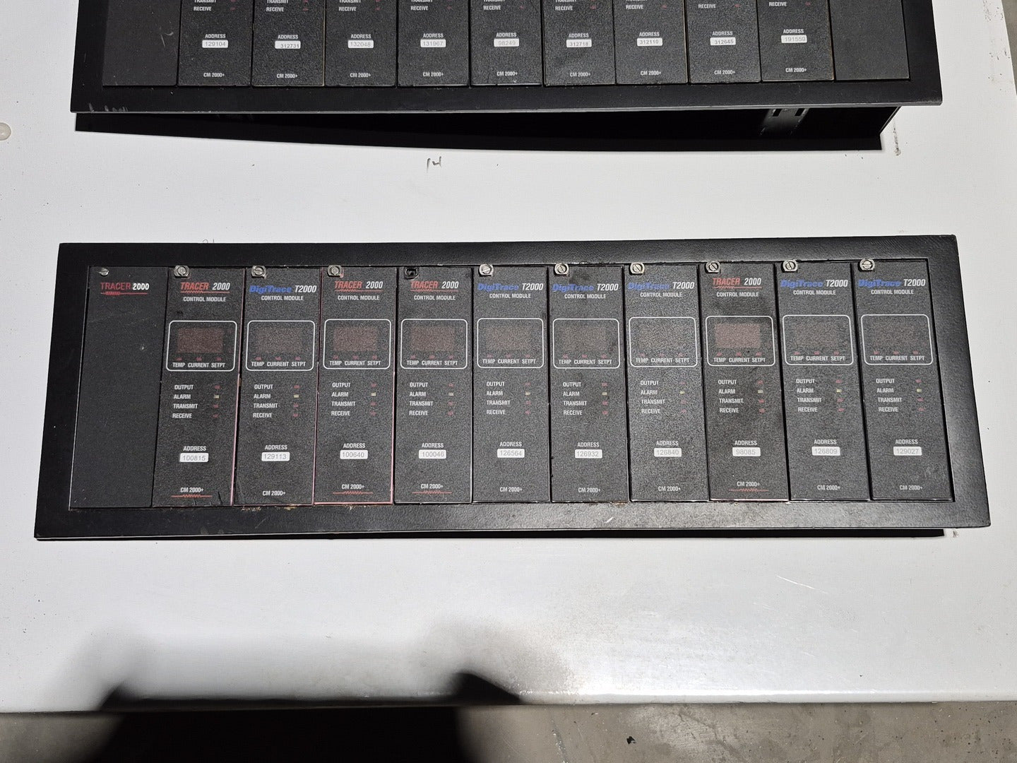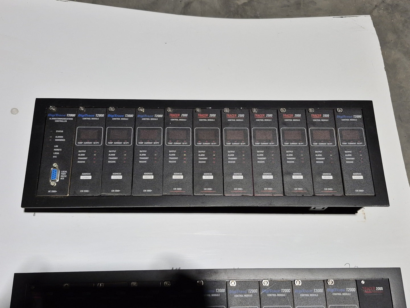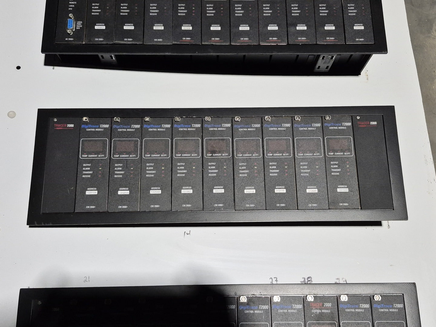 Description: Heat trace controller panel with 29 control modules and 1 alarm/communications module present. All control modules are model CM 2000+, but, some are under different production era branding names. Alarm communications module has model number AC 2000+. CM 2000+ Module Specifications Operating Ambient: -40F to 149F Control Output: 12 VDC nominal, 50 mA max. Sensor Inputs: Two 3-wire 100 ohm platinum RTDs Power Requirements: 120 to 240 VAC nominal, 1-Phase, 5 W max. Temperature Measurement Range: