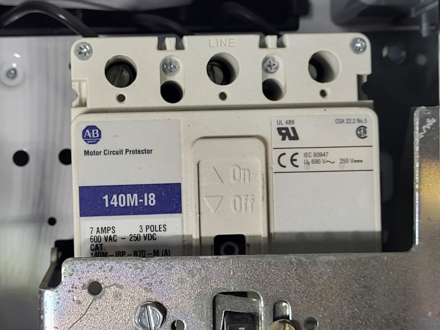 Breaker: Allen Bradley 140M-I8, 7 amps, 3 pole, 600 VAC - 250 VDC
