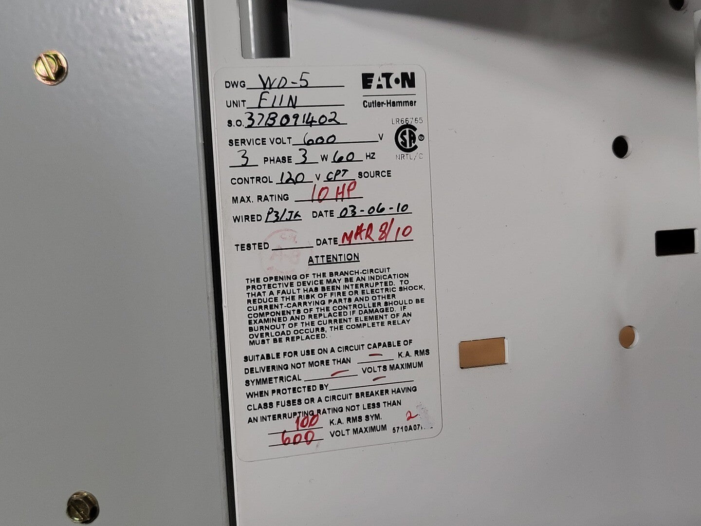 **Fits 2100 MCC Frame Input Rating: 3-ph, 525-690V, 50/60 Hz, 13.5A Output Rating: 3-ph, 0-690V, 0-320 Hz, 10/13.5A Power: 7.5CT/10VT VFD Model: SVX007A1-5A4N1 Breaker Make: Eaton Cutler Hammer Amperage: 20 amps Voltage: 600 volts Poles: 3 Trip Model: LFD3070R Control Relay x 2 Make: Eaton Model: XTRE10B22 Transformer Model: 5642-14-120-00 Primary volts: 600v Secondary volts: 120v Reactor Make: Rex Model: 11C5LF |