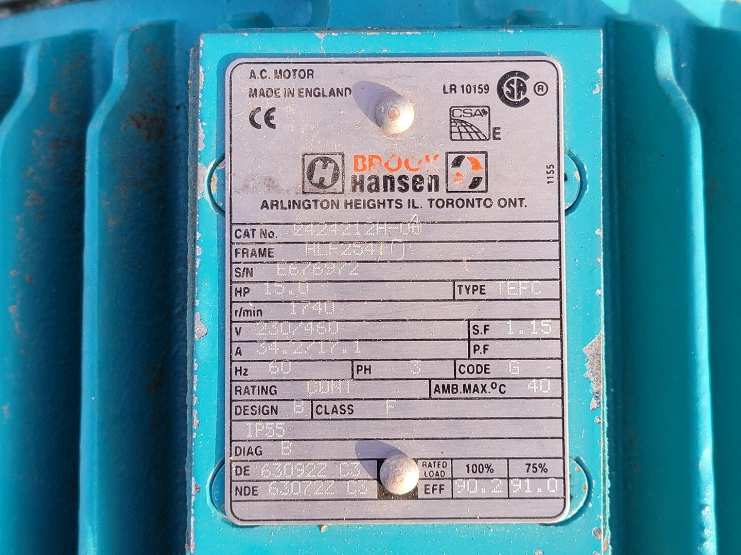 15 hp, 230/460 volts, 1740 rpm, HLF254T AC Motor 2424212H-00