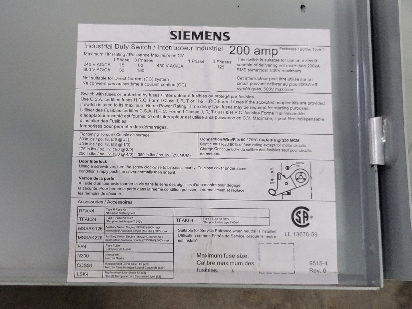 200A, 240V, 3-Pole, Enclosed Fused, Industrial Duty Switch ID324