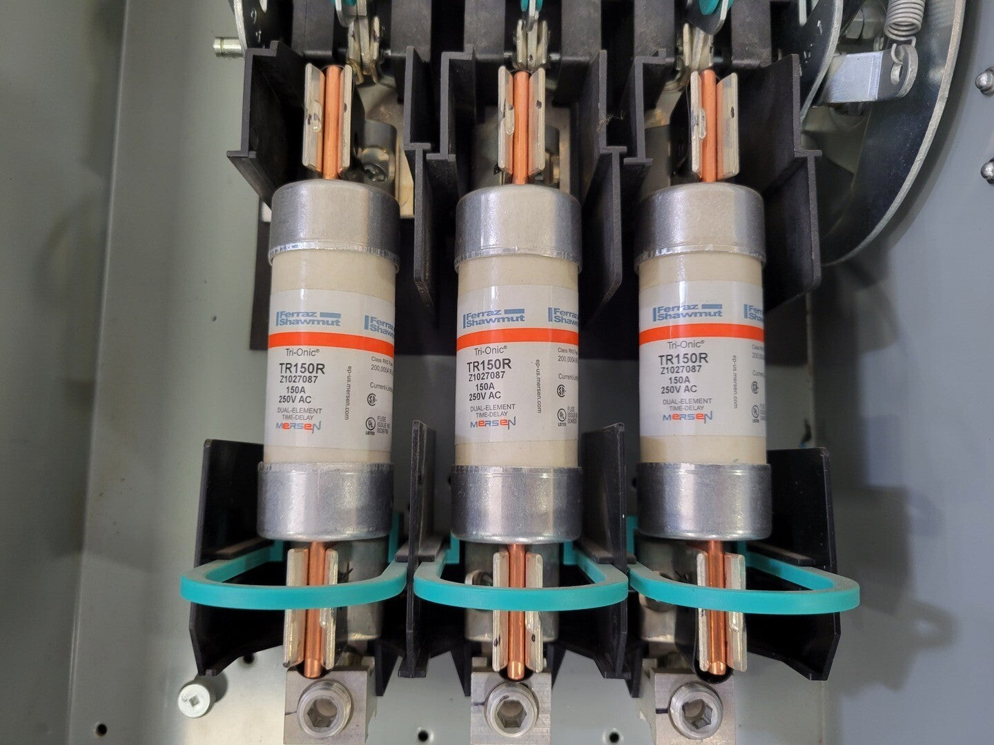 3 x MERSEN 150A, 250V AC, Dual-Element, Time-Delay Fuses (SERIES: Tri-Onic, MODEL: TR150R)