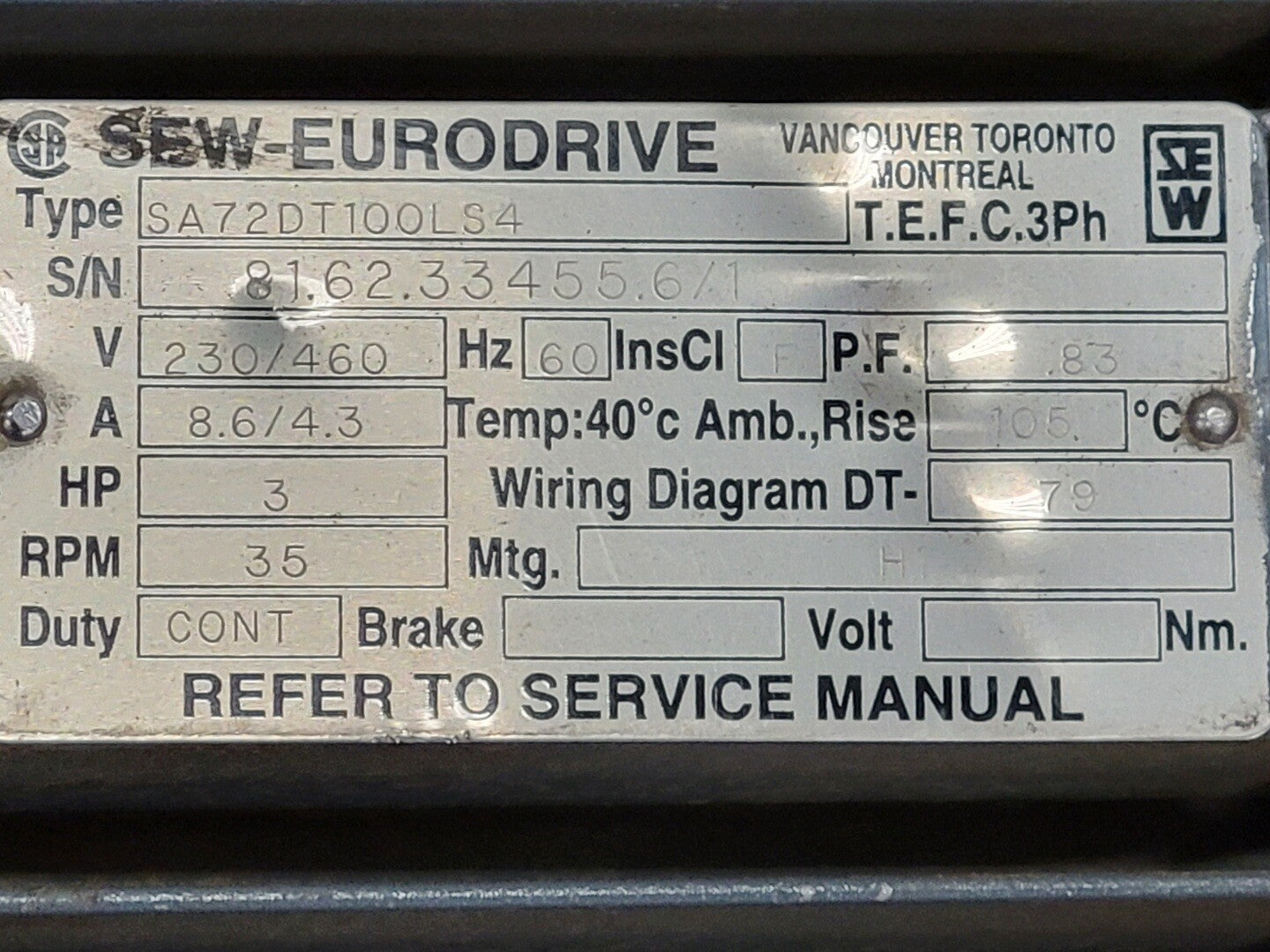 3 hp, 230/460 volts, 35 rpm, Electric Motor SA72DT100LS4