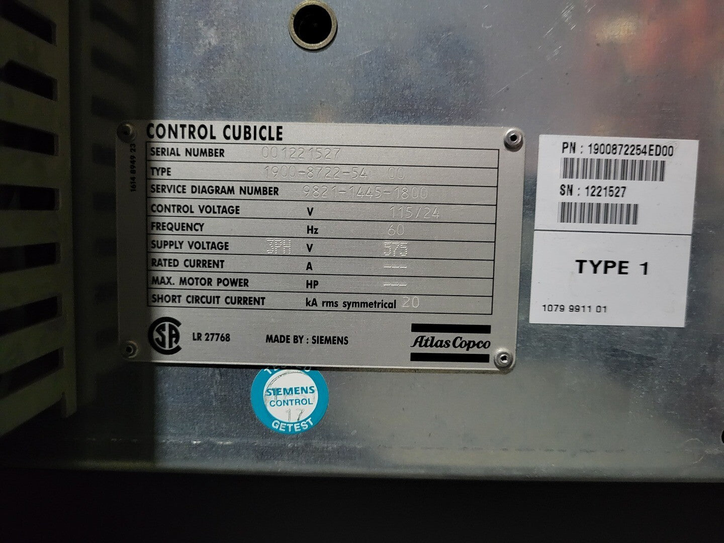 Rotational shaft speed: 1789 rpm Control cubicle & fan voltage: 575 volts |
