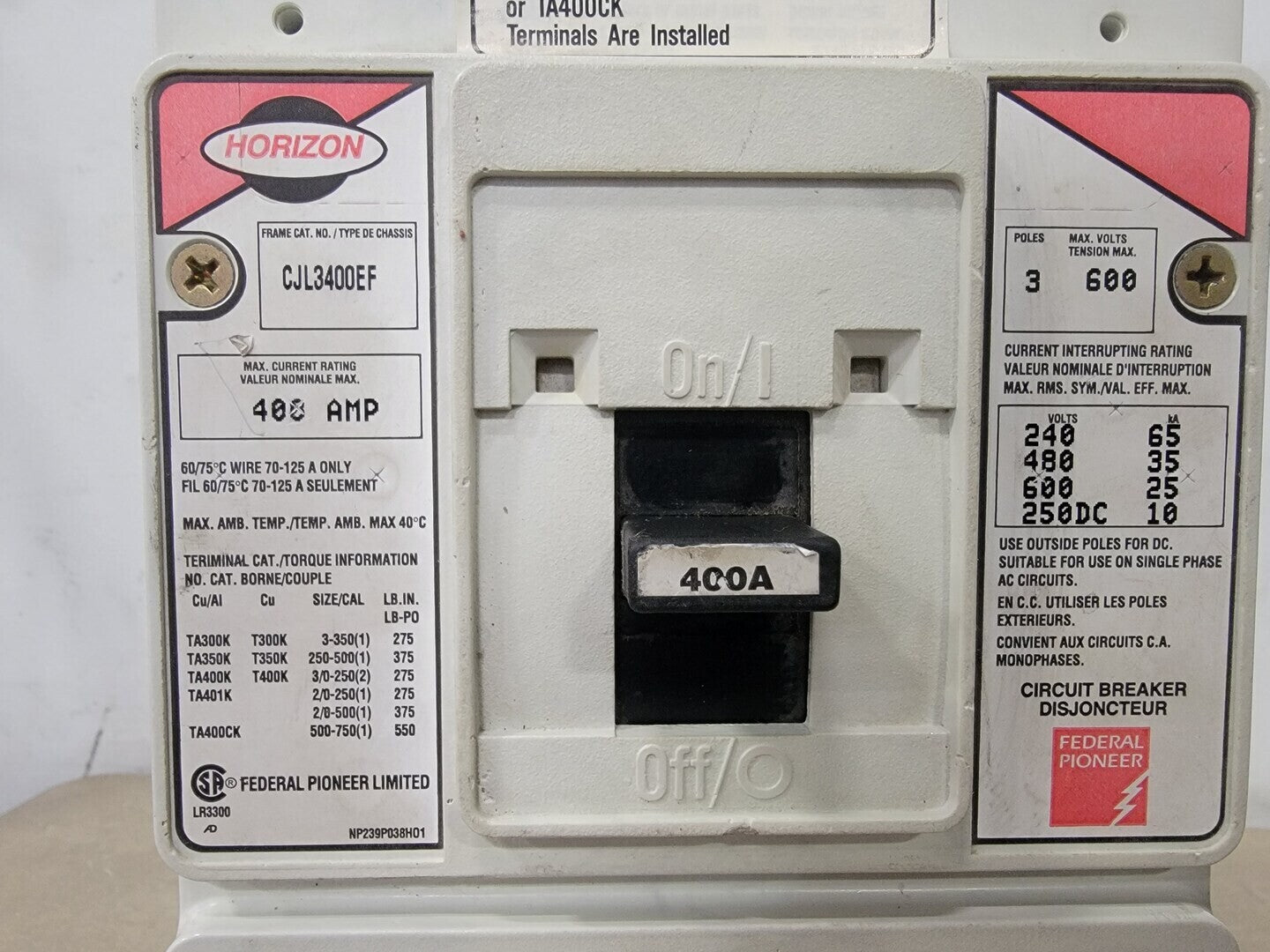 400 Amp, 3 Pole, 600 Volts Circuit Breaker CJL3400EF