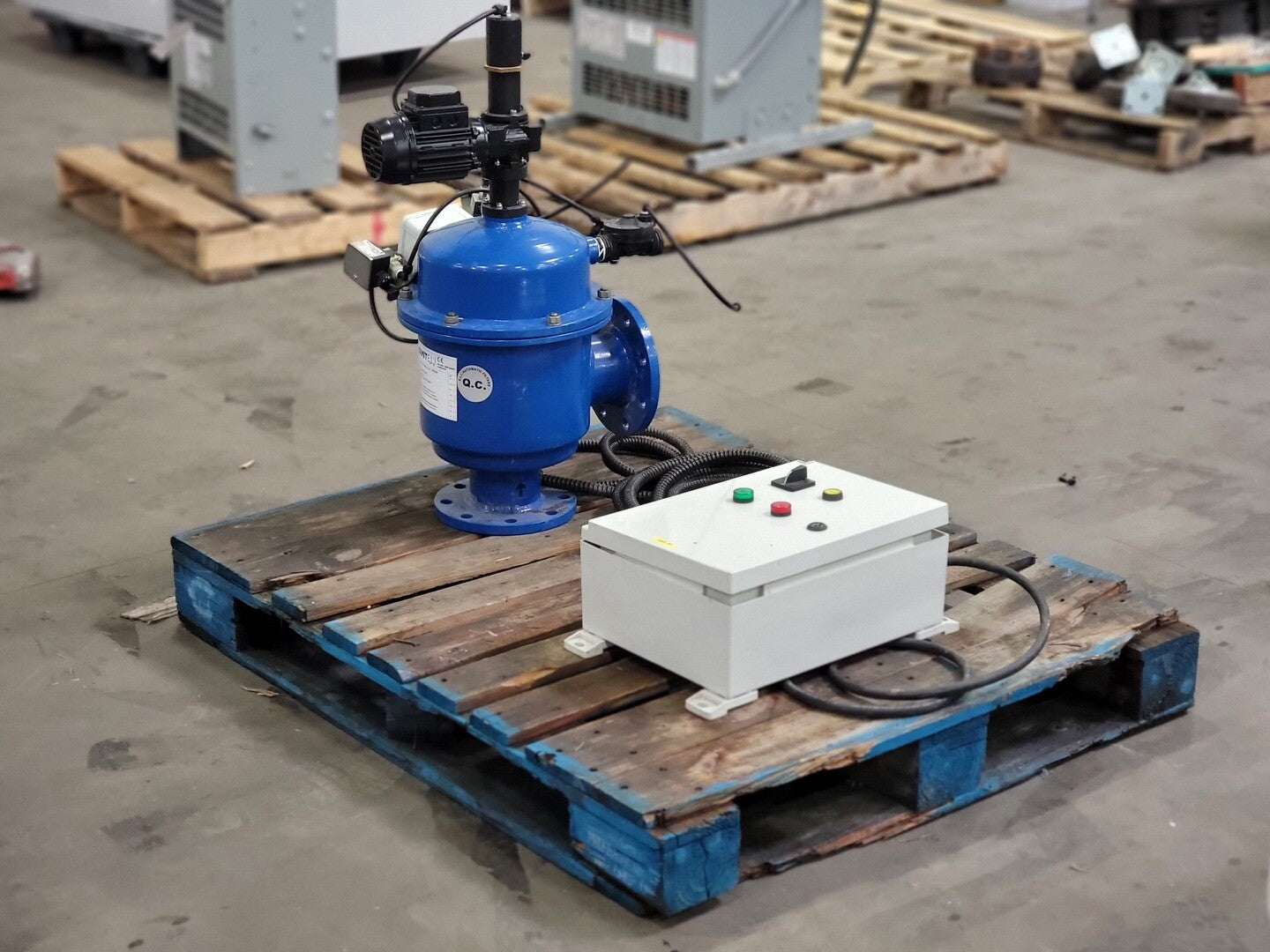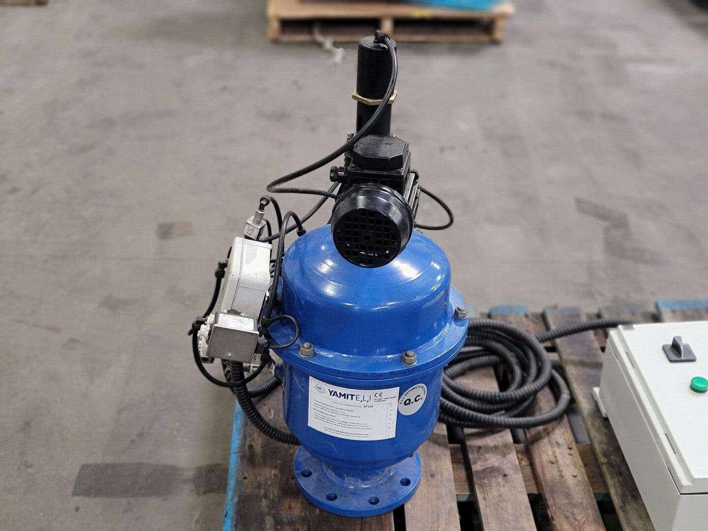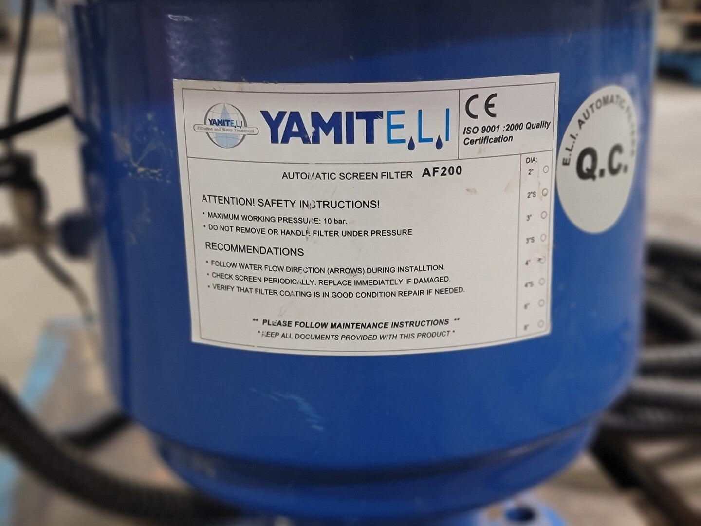 Max. Working Pressure: 10BAR Housing Material: Carbon Steel ST37.2 Coating: Electrostatic Oven Baked Polyester-Epoxy Powder Coating (150-200 micron thick) Filter Element: AISI 316SS Connection: Flanged, 4in. Motor: Make: VEMAT Type: VTB 56A S/N: 1501864232 Power: 0.09kW Voltage (60hz): 254/440V Amps (60hz): 0.68/0.40 RPM (60hz): 1680 |