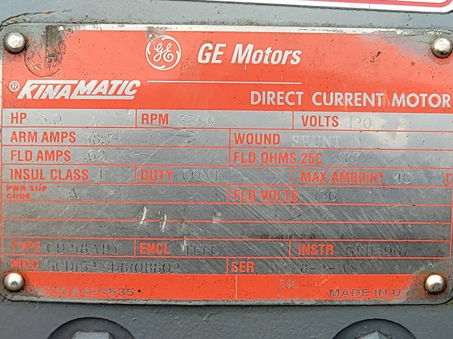 5 hp, 120 volts, 3500 rpm Electric Motor 5CD152XD810B802