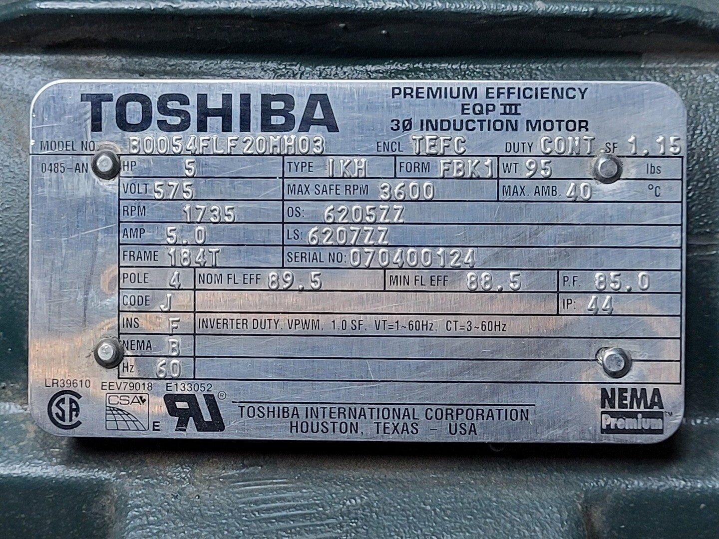 5 hp, 575 volts, 1735 rpm, 184T Electric Motor B0054FLF20MH03
