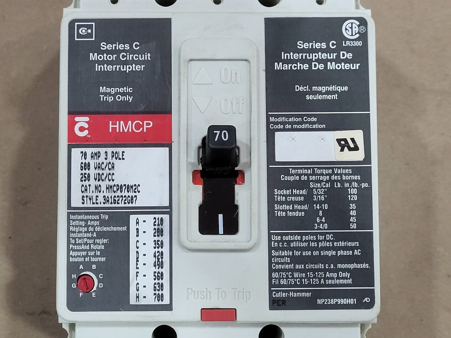 Type: HMCP Frame: J-K Mounting: Din Rail, Panel Connection: Feed-Thru Protection: Thermal Magnetic Function: Instantaneous Terminal: Steel Lugs, CU Wire Magnetic Trip Range: 210-700 A VDC: 250 V |