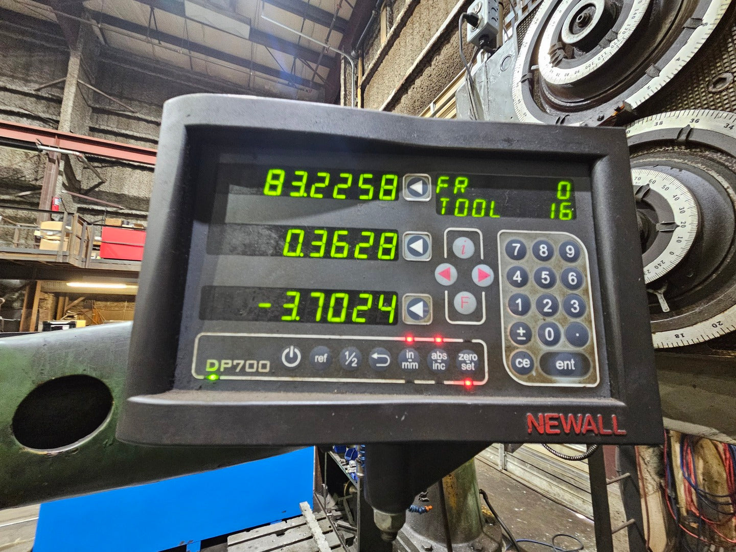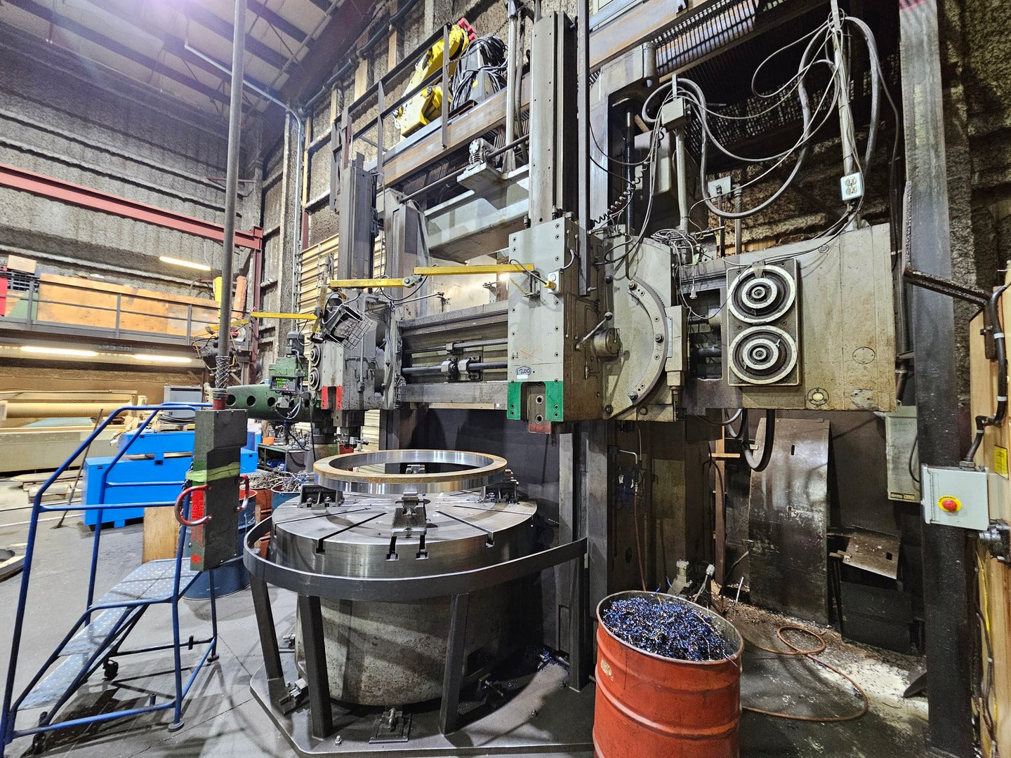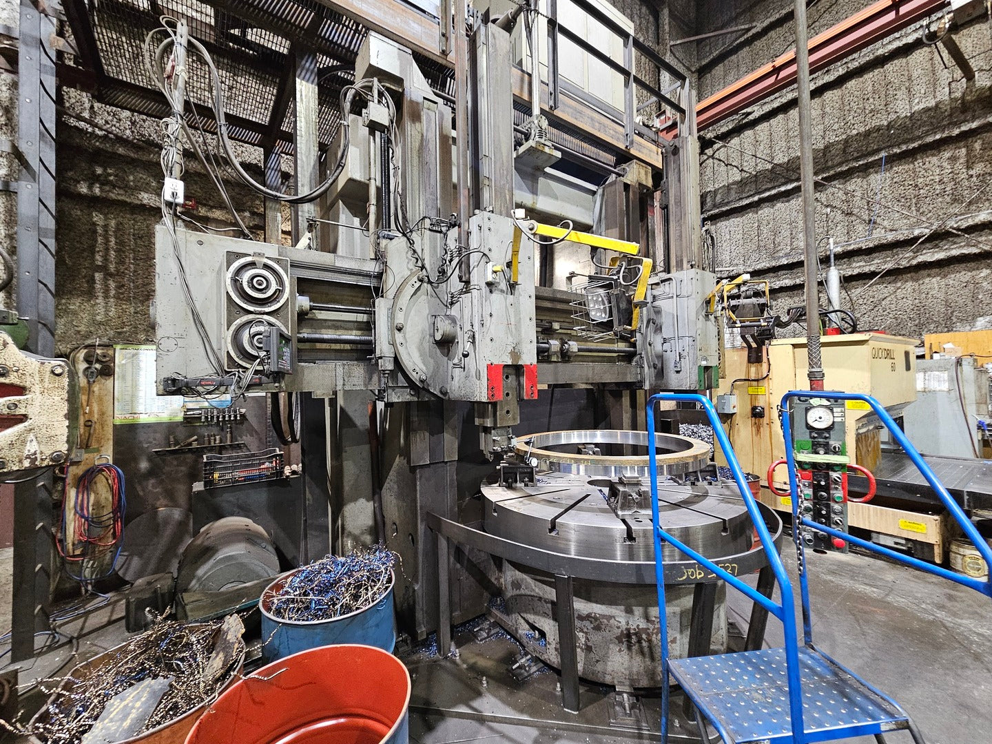 Drive motor was updated and a new digital drive was installed. Table diameter: 60" Height under saddle: 60" Height under ram face: 68" Height under turret face: 72" Vertical travel (below saddle) of ram heads (Std.): 48" Vertical travel (below saddle) of turret head (Std.): 30" Vertical travel of side head above table: 56" Horizontal travel of ram heads: 42" Horizontal travel of turret head: 45" Horizontal travel of side head ram: 32" Travel past center - ram heads: 1/2" Travel past center - turret heads: 1/2" Travel of rail: 50" Swivel of ram either side of vertical: 45° Size of bore in ram heads: 3" Size of bore in turret heads: 3" Maximum swing, with or without side head: 72" Feeds per rev. of table (infinitely variable): .0025" - .250" Table speed range rpm (infinitely variable): 1.3 - 272 Table top to floor: 36-1/4" Overall height machine top to floor: 12'2" Overall height pendant top to floor: 16' Overall height top of ram to floor: 16' |
