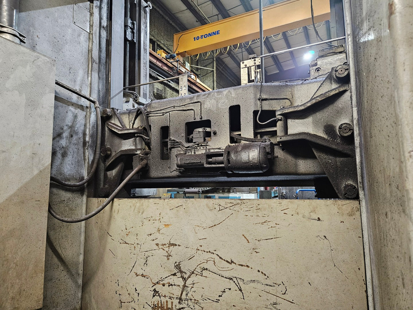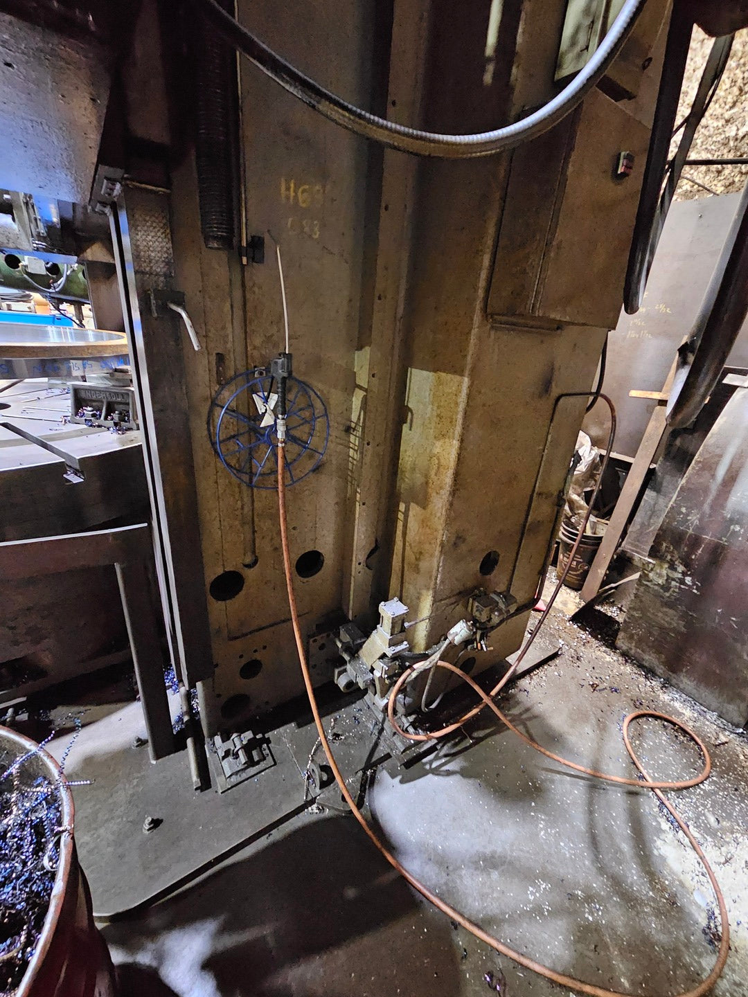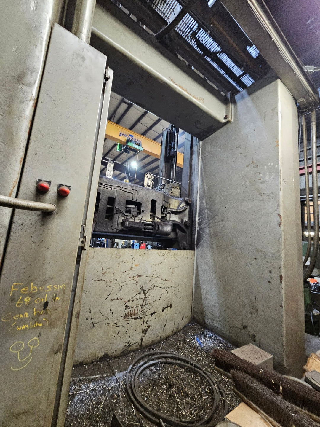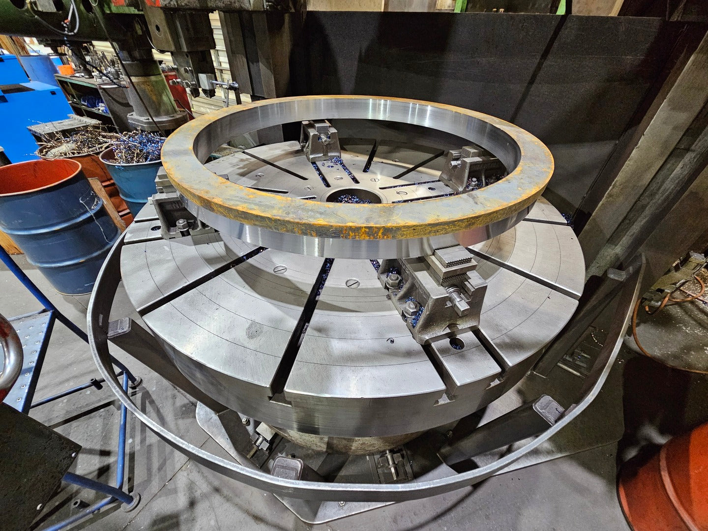 Drive motor was updated and a new digital drive was installed. Table diameter: 60" Height under saddle: 60" Height under ram face: 68" Height under turret face: 72" Vertical travel (below saddle) of ram heads (Std.): 48" Vertical travel (below saddle) of turret head (Std.): 30" Vertical travel of side head above table: 56" Horizontal travel of ram heads: 42" Horizontal travel of turret head: 45" Horizontal travel of side head ram: 32" Travel past center - ram heads: 1/2" Travel past center - turret heads: 1/2" Travel of rail: 50" Swivel of ram either side of vertical: 45° Size of bore in ram heads: 3" Size of bore in turret heads: 3" Maximum swing, with or without side head: 72" Feeds per rev. of table (infinitely variable): .0025" - .250" Table speed range rpm (infinitely variable): 1.3 - 272 Table top to floor: 36-1/4" Overall height machine top to floor: 12'2" Overall height pendant top to floor: 16' Overall height top of ram to floor: 16' |