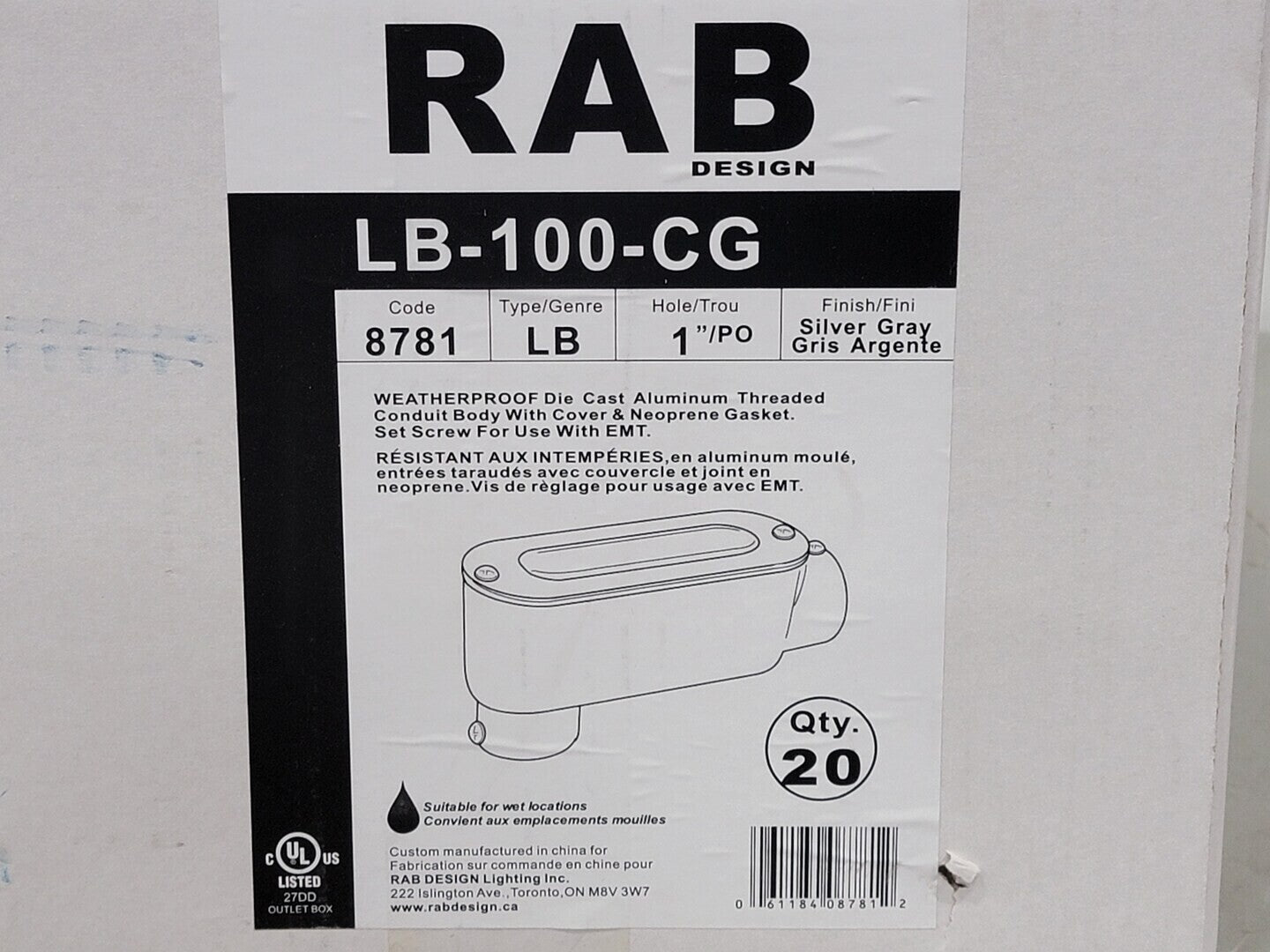 1" Aluminum Conduit Body LB-100-CG w/ Gasket & Cover (Box of 20)