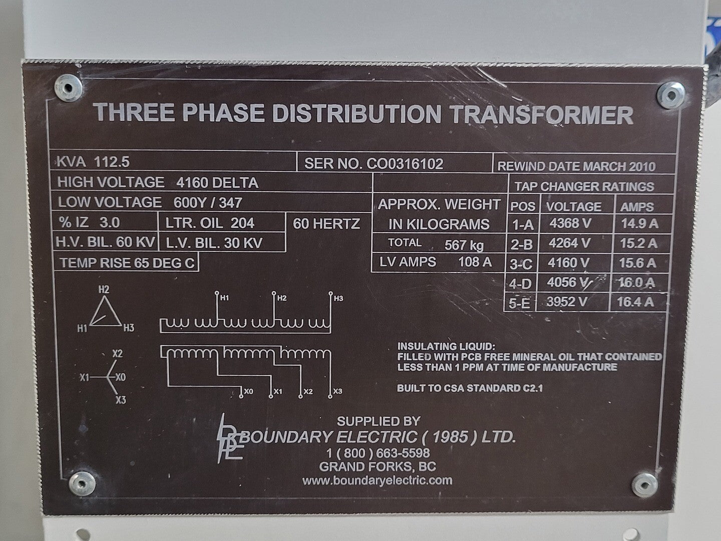 112.5 kVA Three Phase Distribution Transformer Pri 4160V, Sec 600Y/347V