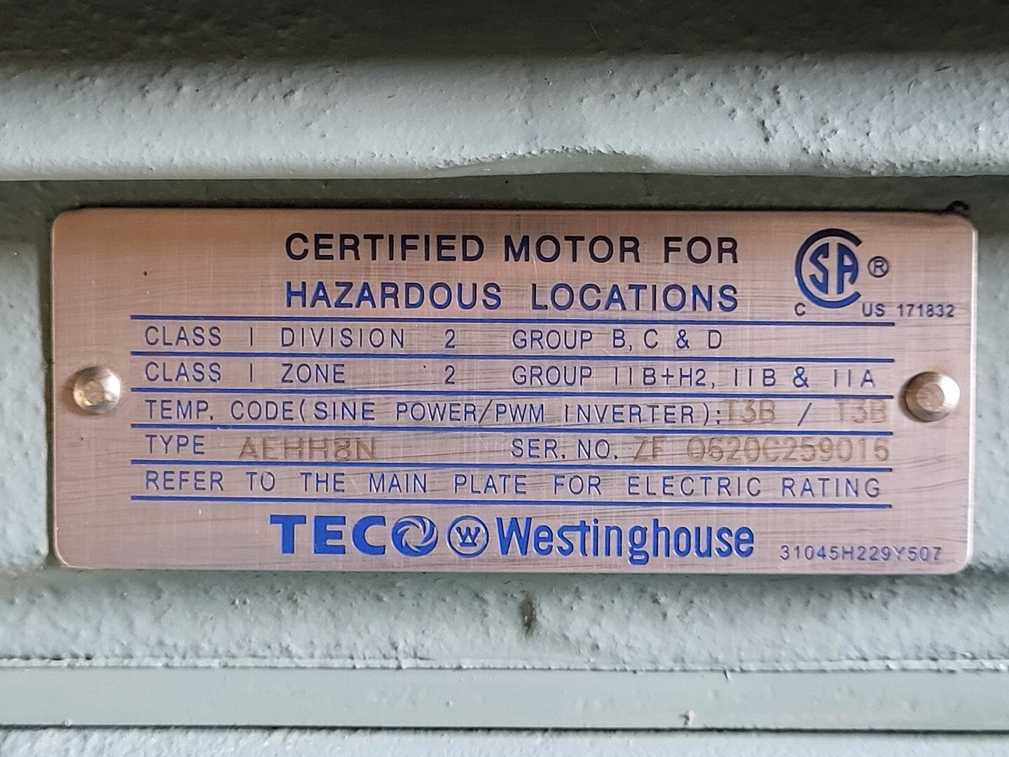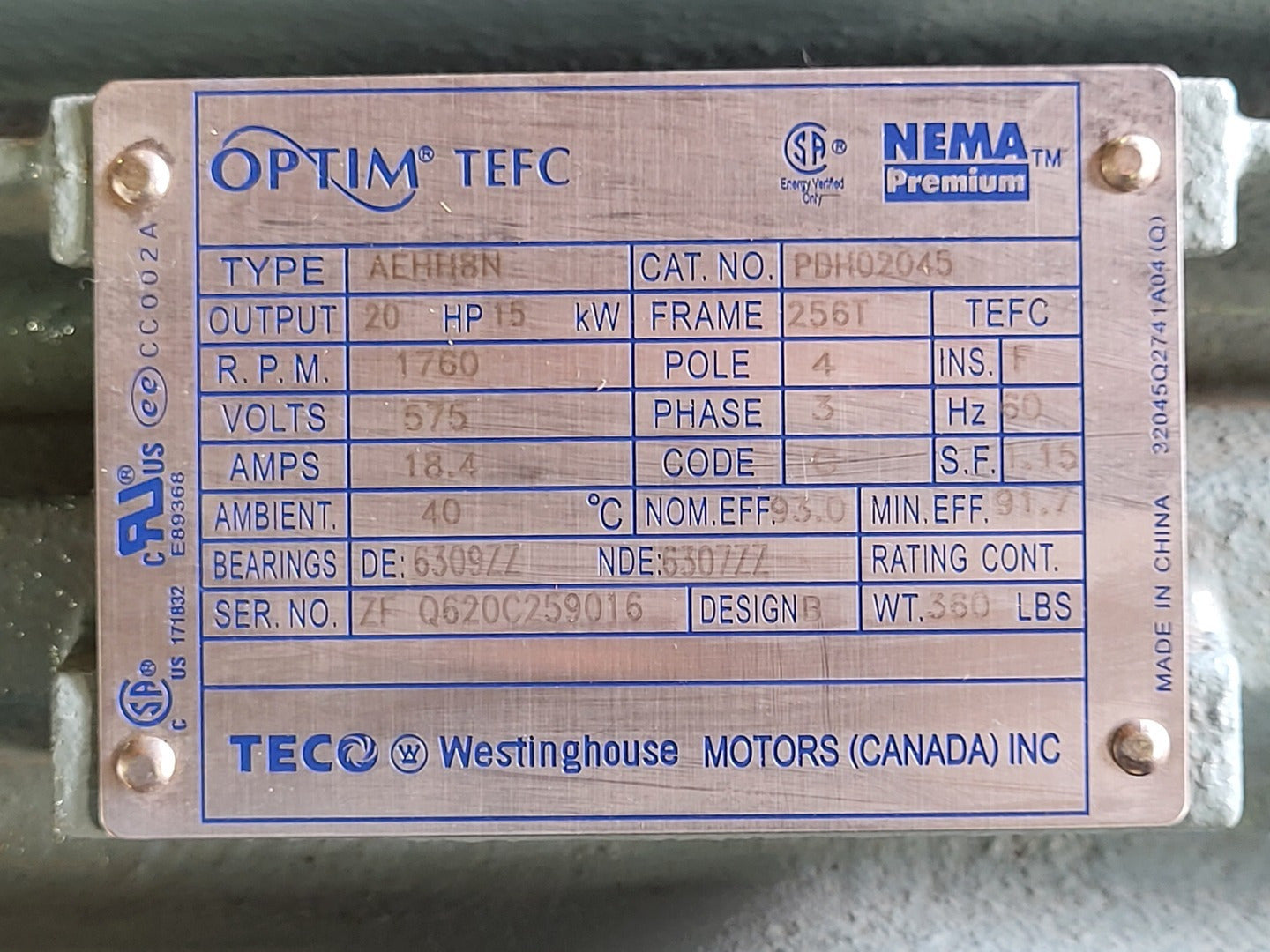 20 hp, 575 volts, 1760 rpm Electric Motor