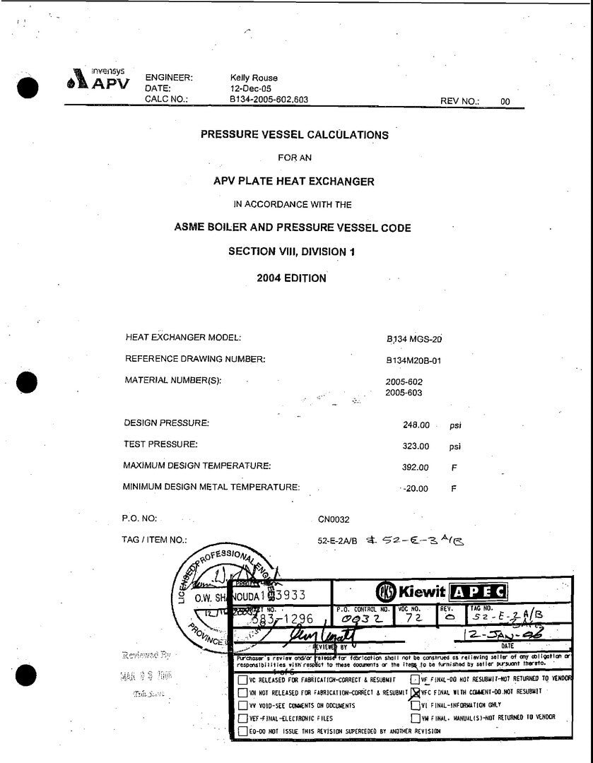 Min. Design Metal Temperature: -20 oF @ 248 PSI/FV