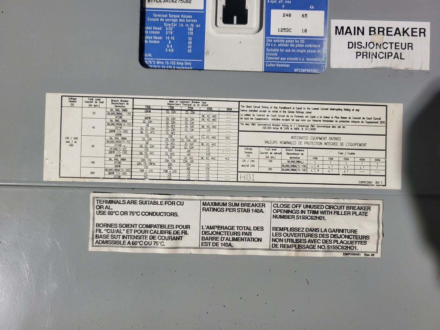 Main breaker: 225 amps, 240 volts AC, 3 pole, ED3225