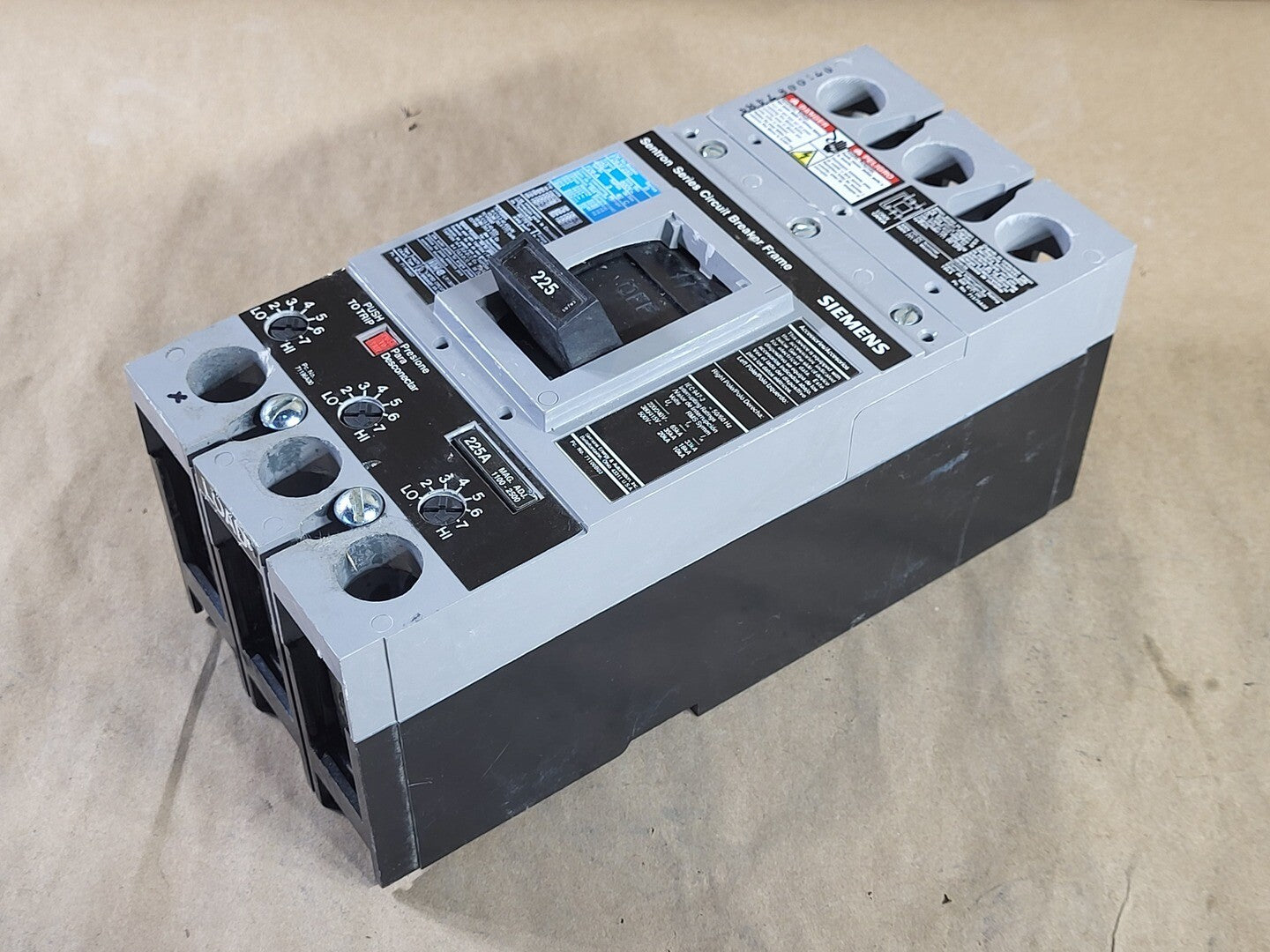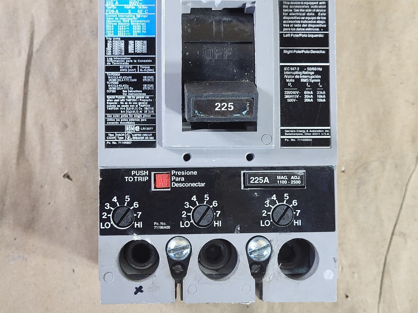 The Siemens FD63F250 is a molded case circuit breaker with an FD frame, three-phase, 3-pole, featuring thermal-magnetic protection, designed for industrial and commercial applications. It offers a rated current of 250 A and supports up to 600 VAC / 500 VDC, with an interrupting capacity of 35 kA at 480 V and 22 kA at 600 V. It mounts using a bolt-on connection and is UL and IEC certified under molded case circuit breaker standards.