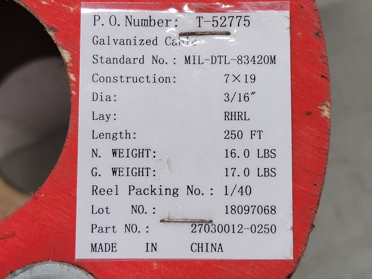3/16" Galvanized Cable 27030012-0250