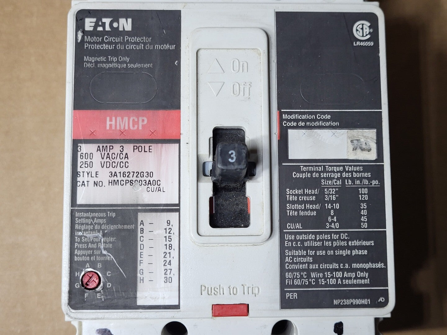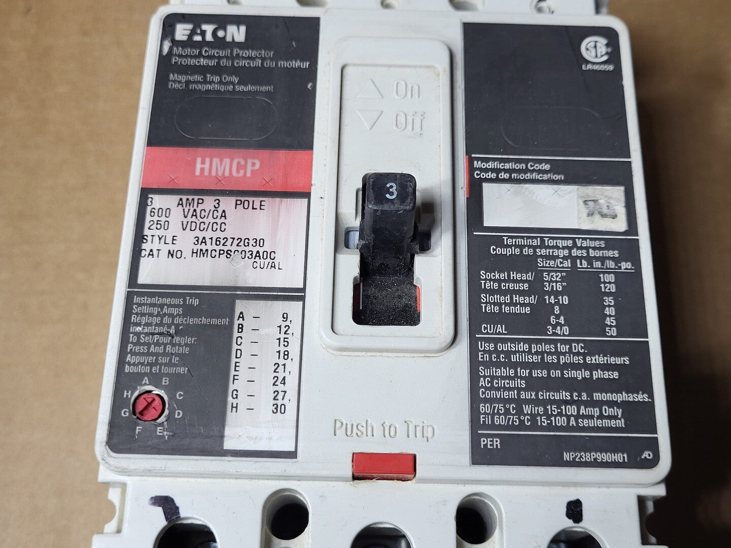 3 Amp 3 Pole 600 Volts Circuit Breaker HMCPS003A0C