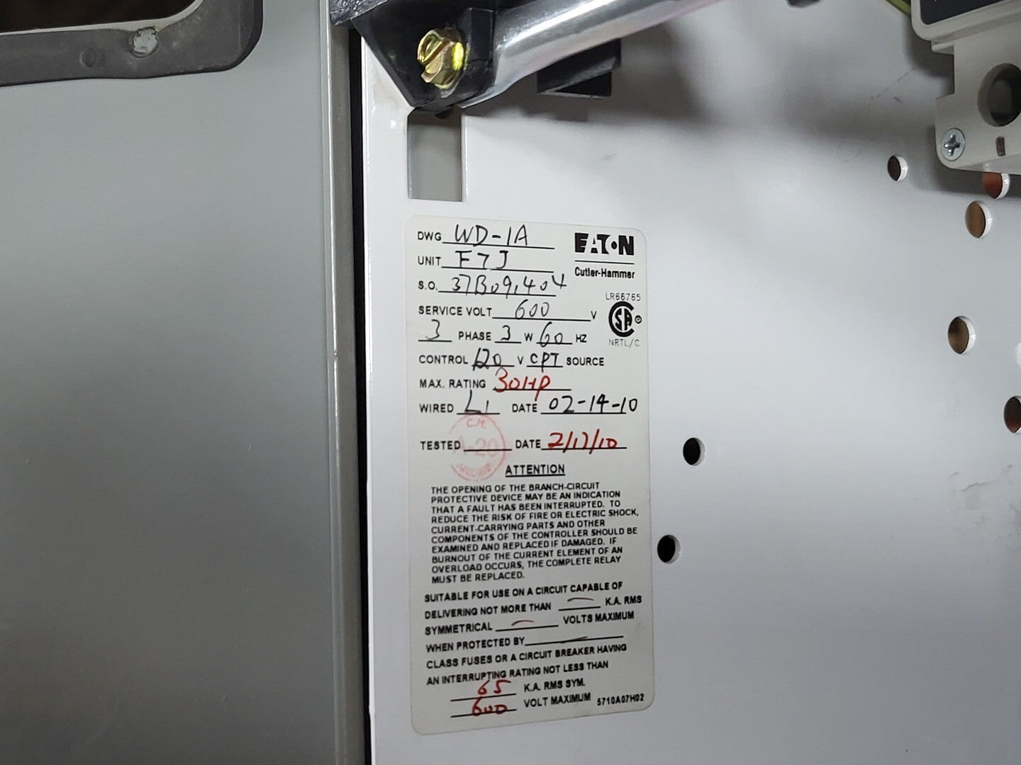 Circuit Breaker Maker: Eaton Model: HMCP Voltage: 600V Amps: 100 amps Poles: 3 Ground Fault Relay Maker: Eaton Model: D64RPB30 Overload relay: 24-240 Vac/dc Motor Saver Electronic Overload Relay Maker: Eaton Model: E777-575 Voltage: 450-600VAC Phase: 3 Transformer Maker: MCi Model: 5642-14-120-00 VA: 200VA Primary: 600V Secondary: 120V Contactor Maker: Eaton Model: CN15KN3 Amp: 90 Size: NEMA 3 |