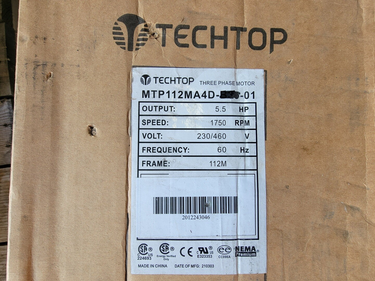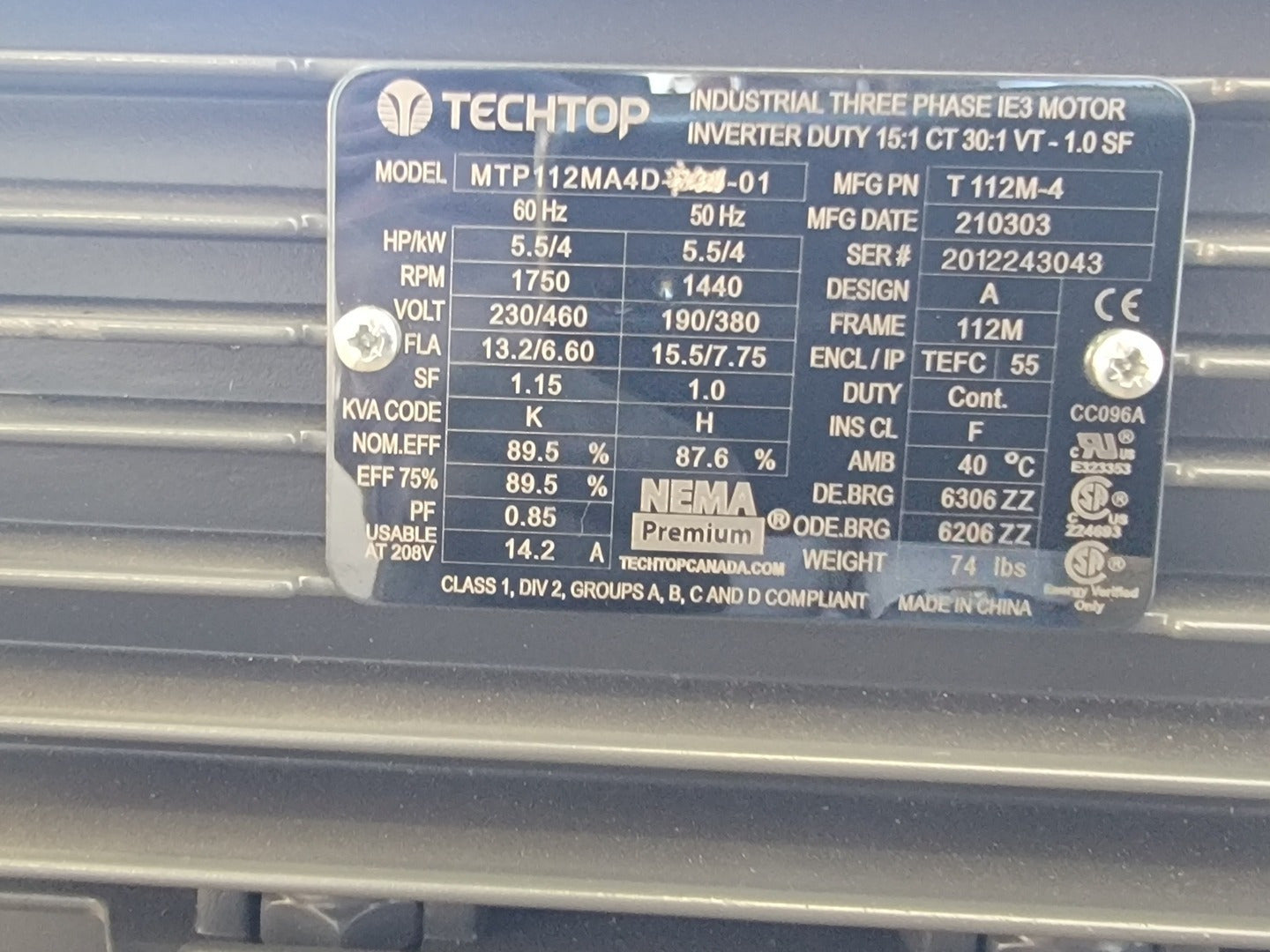 5.5 hp, 230/460 volts, 1750 rpm, 112M, Electric Motor MTP112MA4D