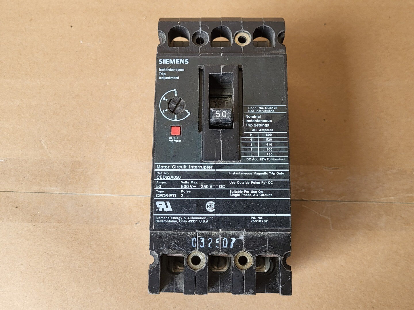 The Siemens CED63A050 is a 3-pole molded case circuit breaker designed for efficient circuit protection in industrial and commercial electrical systems. It has a rated current of 50 A and supports voltages up to 600 VAC and 250 VDC. Equipped with a thermal-magnetic trip unit, it protects circuits from overloads and short circuits. The breaker features an interrupting capacity of 25 kA at 480 VAC and 10 kA at 600 VAC, making it suitable for a variety of electrical applications. It mounts bolt-on and is certified to UL 489 and IEC 60947-2 standards.