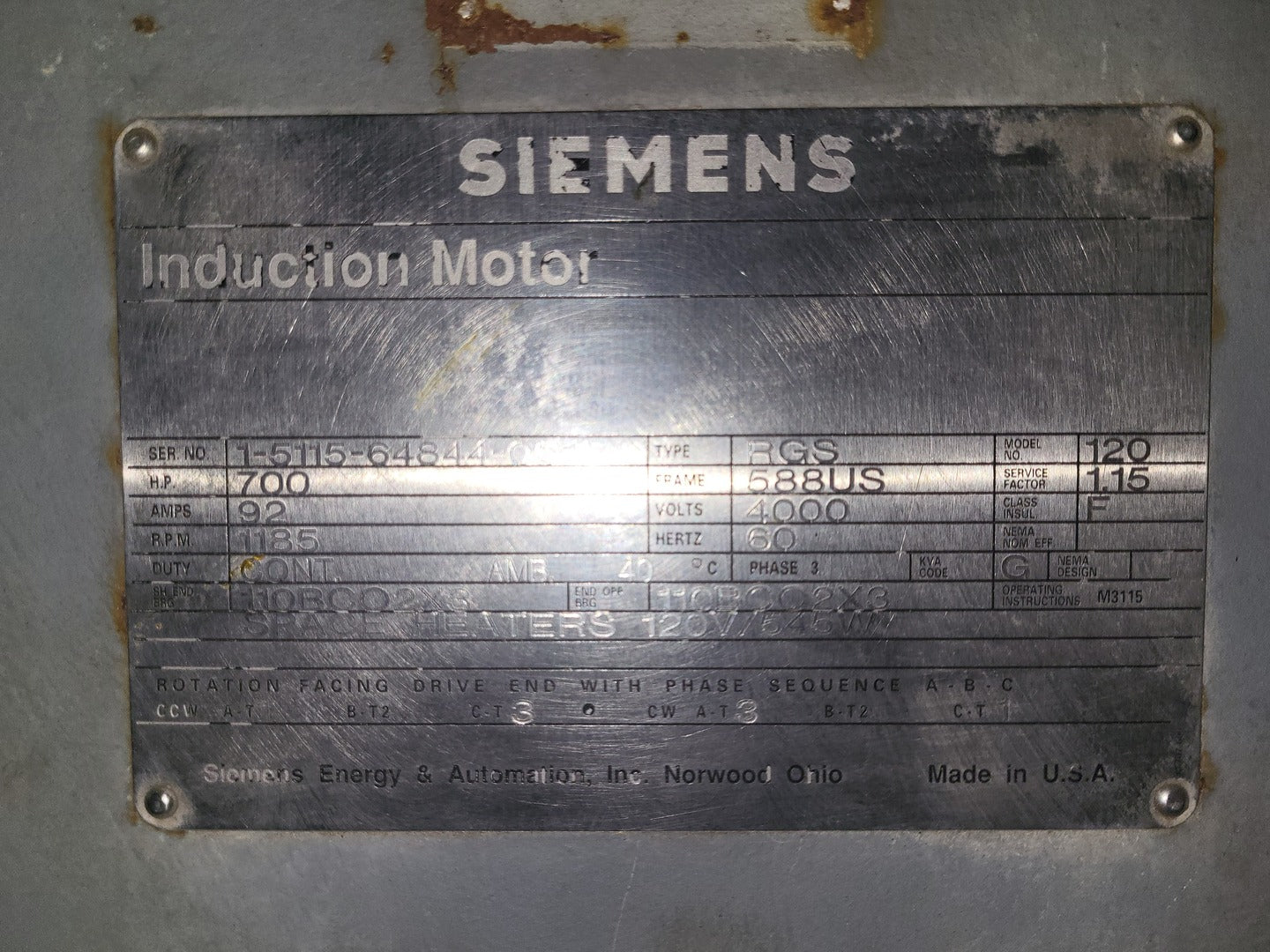 Type: RGS Model No.: 120 Amps: 92 Service Factor: 1.15 Insulation Class: F |