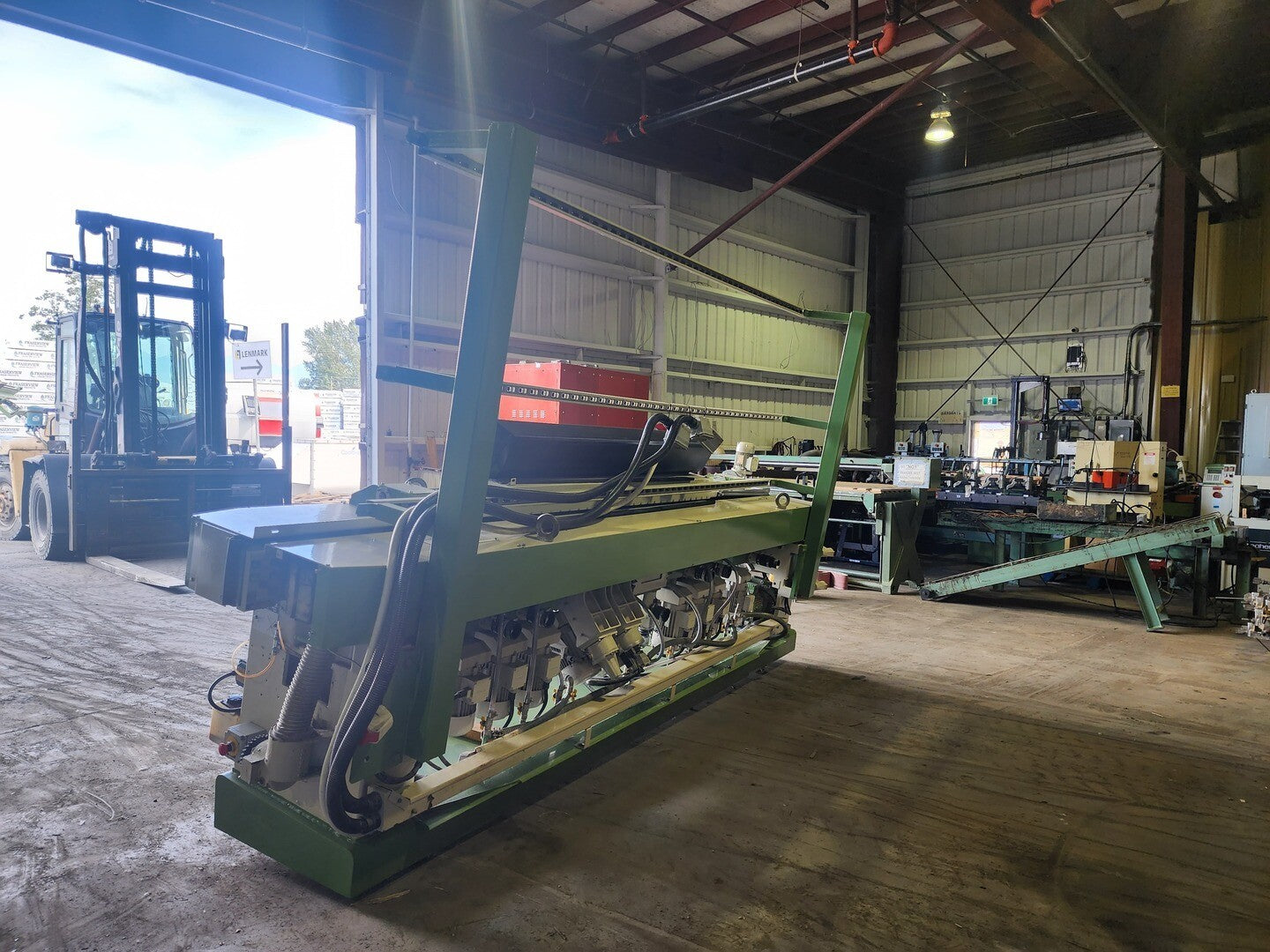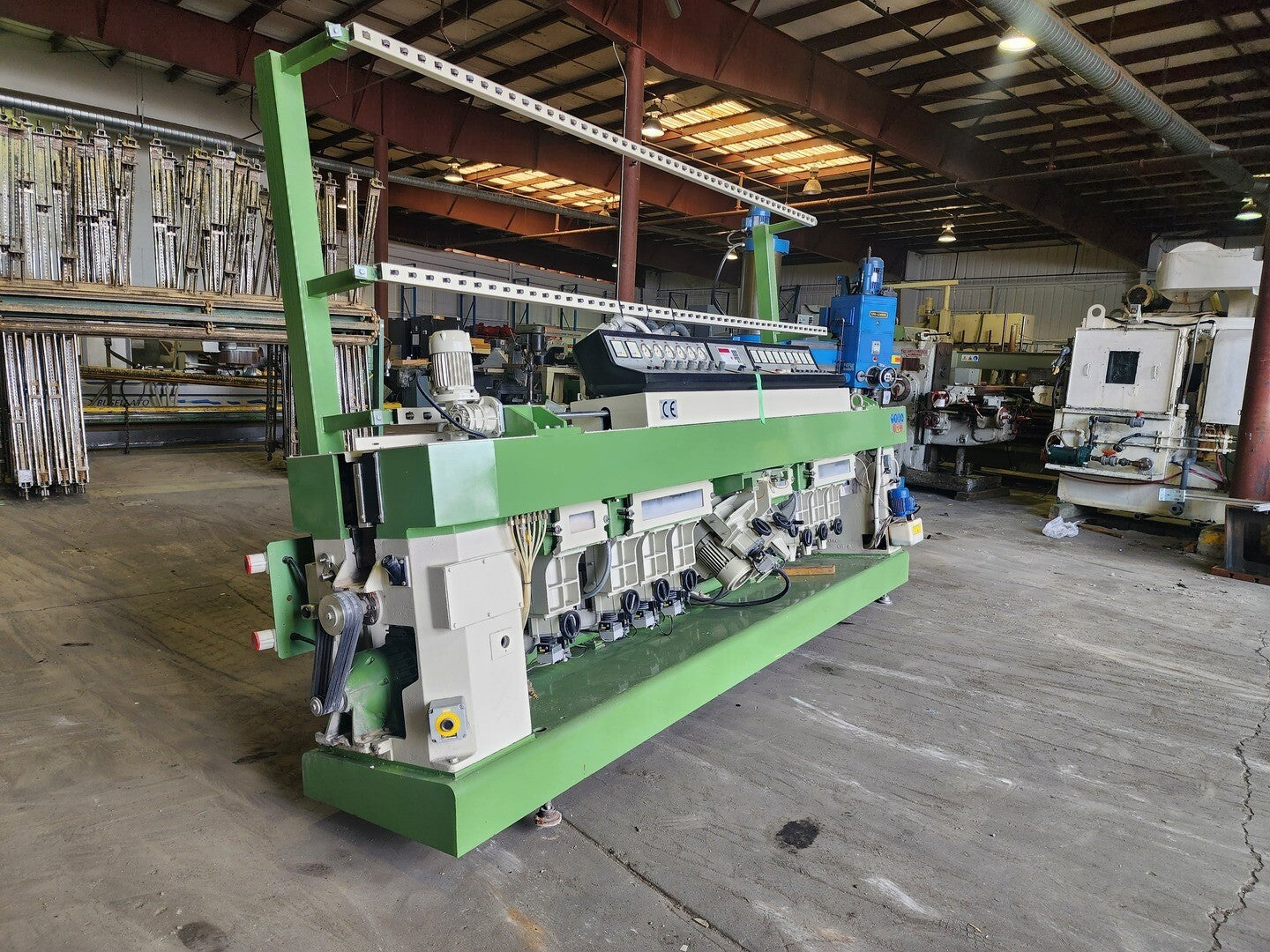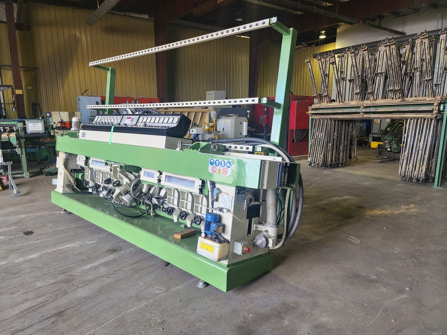 CR 1111 is a straight-line edging machine for producing flat edges with arrises. It comprises 11 wheels, 7 for edging and polishing the flat edge and 4 for arris production. It can produce a semi-polished 45 deg. mitre, up to a width of 15 mm