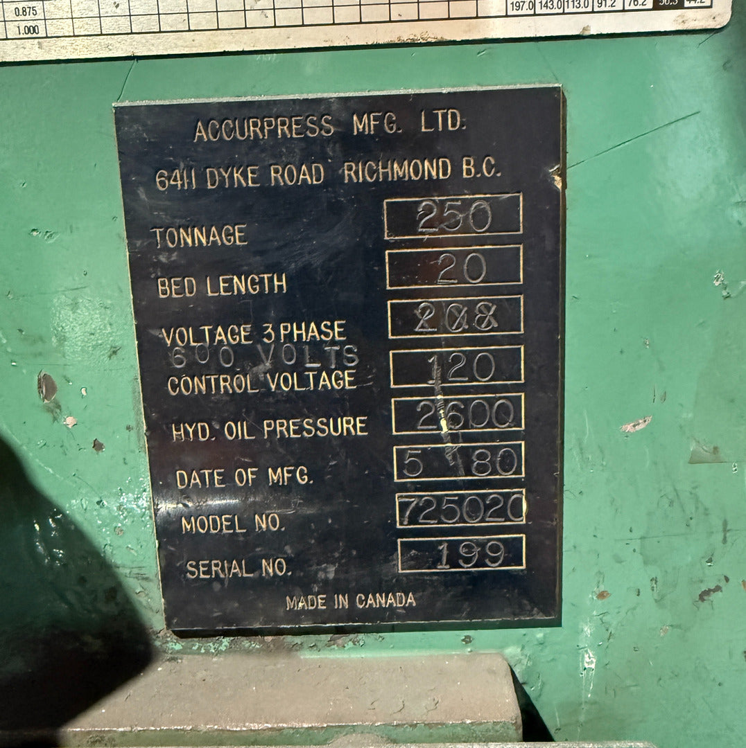 **Refurbished in 2012 Distance Between Frames: 198" Bed Height: 34" Bed Capacity Width: 12" Length of Ram Stroke: 8" Open Height: 16" Closed Height: 8" Throat Depth: 10" Fast Approach: 57 IPM Slow Bend: 16 IPM Fast Return: 130 IPM Hydraulic Oil Pressure: 2600 |