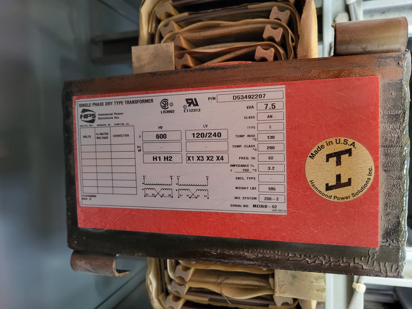 • HAMMOND 7.5 kVA Transformer, Pri. 600 Sec.120/240, D53492207
