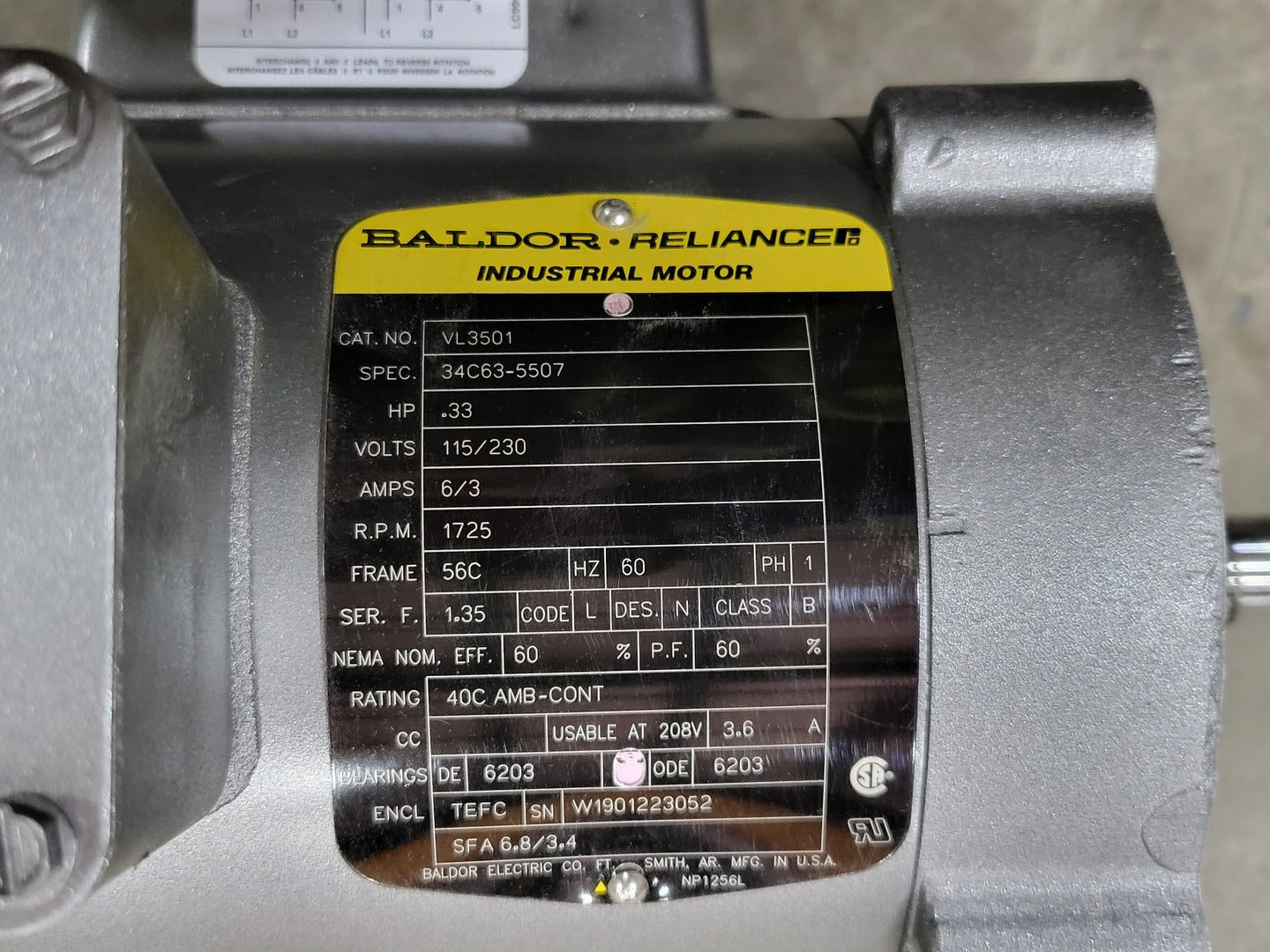 0.33 hp, 115/230 volts, 1725 rpm, 56C, 1ph, Electric Motor VL3501