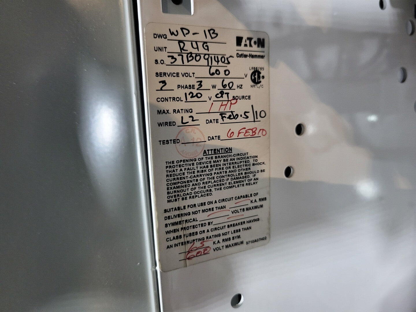 Circuit Breaker Maker: Eaton Model: HMCP Voltage: 600V Amps: 3 amps Poles: 3 Ground Fault Relay Maker: Eaton Model: D64RPB30 Overload relay: 24-240 Vac/dc Motor Saver Electronic Overload Relay Maker: Eaton Model: E777-575-LR Voltage: 450-600VAC Phase: 3 Transformer Maker: MCi Model: 5576-14-120-00 VA: 150VA Primary: 600V Secondary: 120V Devicenet Module Maker: Eaton Model: EC10-120-DN Inputs: 115VAC Contactor Maker: Eaton Model: CN15DN3 Amp: 27 Size: NEMA 1 |