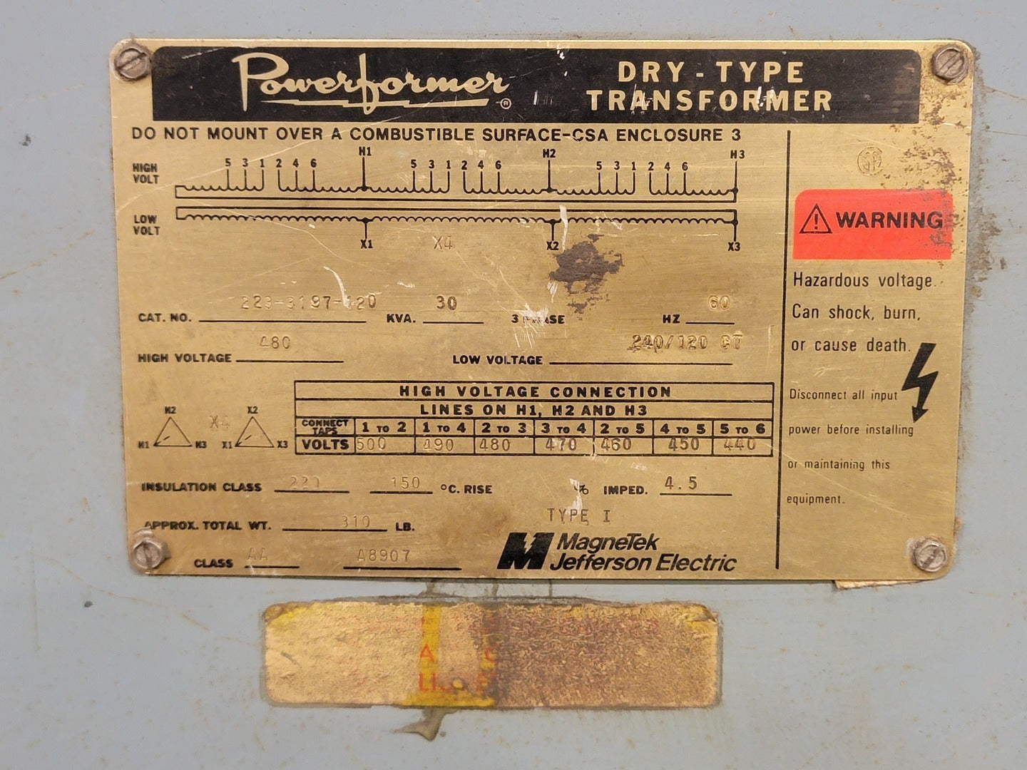 30 kVA Transformer, 480 pri. volts, 240/120CT sec. volts 223-3197-120
