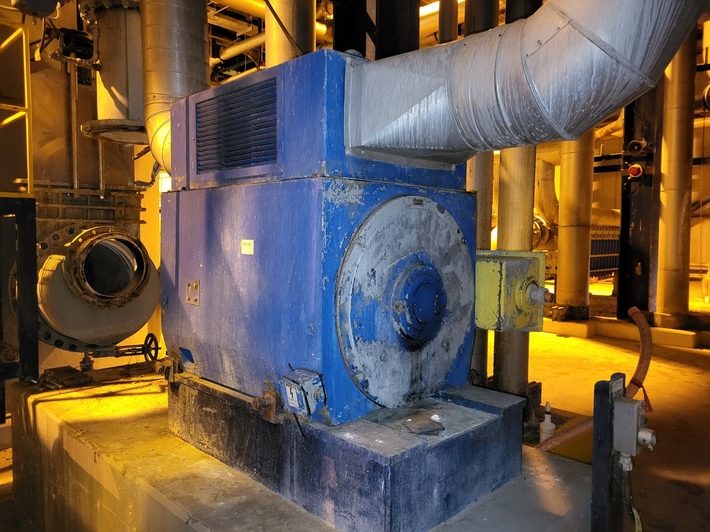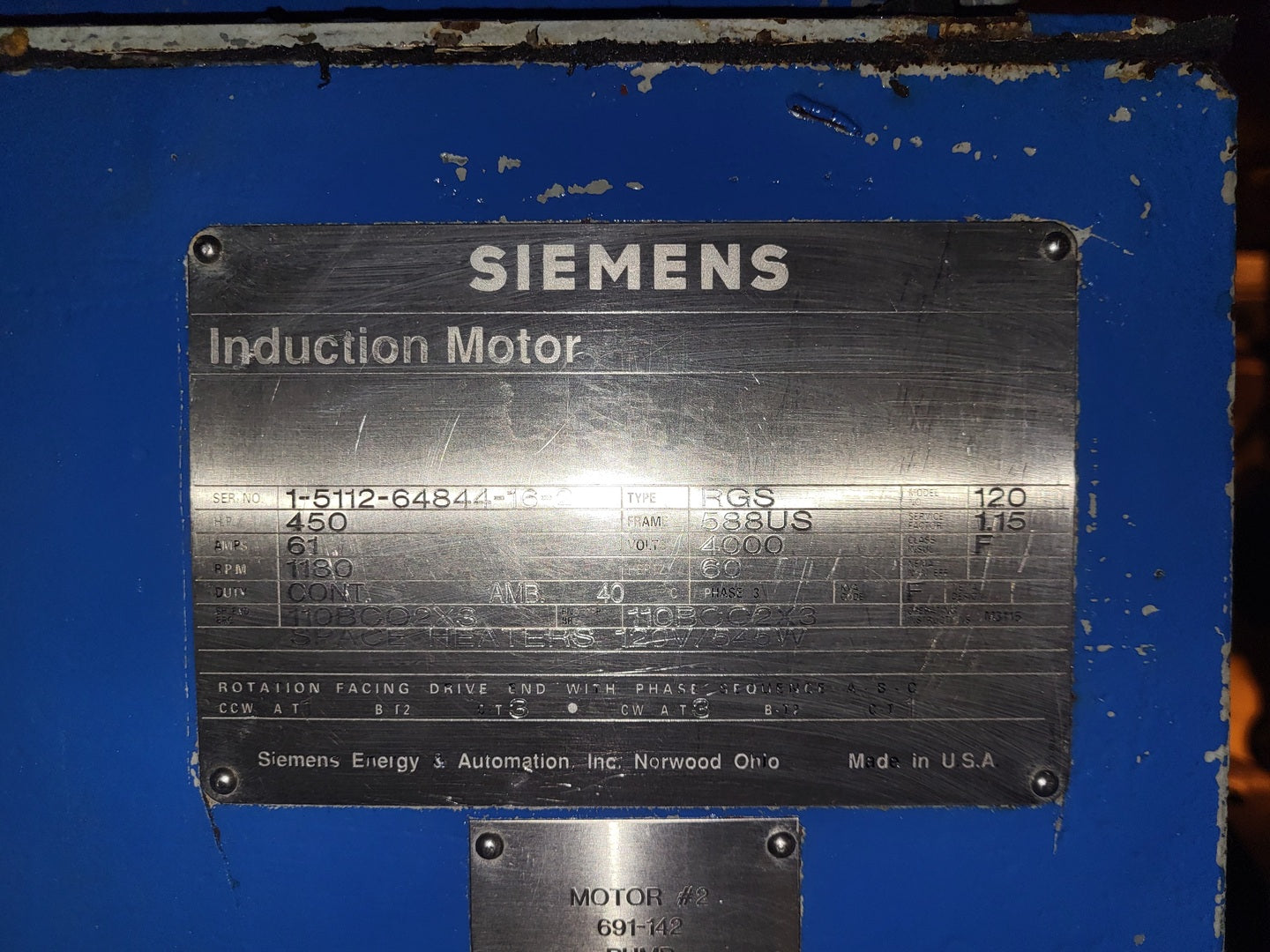 The Siemens Induction Motor Type RGS, model number 120, is an electric AC motor with a horsepower of 450. It operates at 4000 volts with a speed of 1180 rpm and is classified as a 3-phase motor with a frame size of 588US. The motor has a service factor of 1.15 and insulation class F, making it suitable for continuous duty applications.