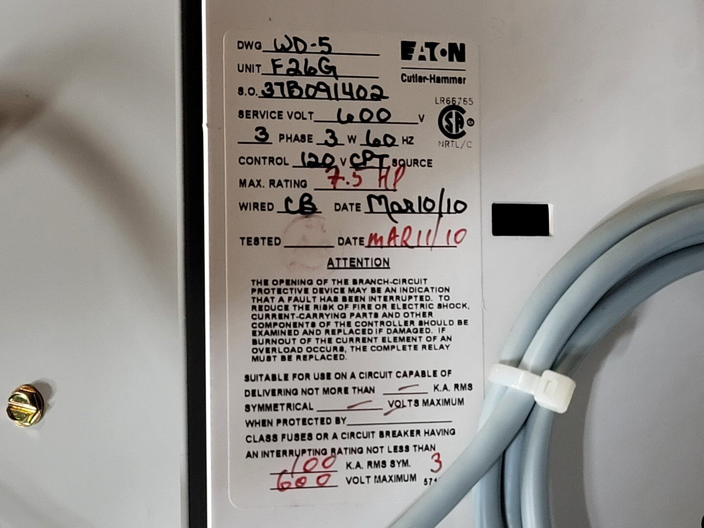 **Fits 2100 MCC Frame Input Rating: 3-ph, 525-690V, 50/60 Hz, 10A Output Rating: 3-ph, 0-690V, 0-320 Hz, 7.5/10A Power: 5CT/7.5VT VFD Model: SVX005A1-5A4N1 Breaker Make: Eaton Cutler Hammer Amperage: 20 amps Voltage: 600 volts Poles: 3 Trip Model: LFD3070R Control Relay x 2 Make: Eaton Model: XTRE10B22 Transformer Model: 5642-14-120-00 Primary volts: 600v Secondary volts: 120v Reactor Make: Rex Model: 11C5LF |
