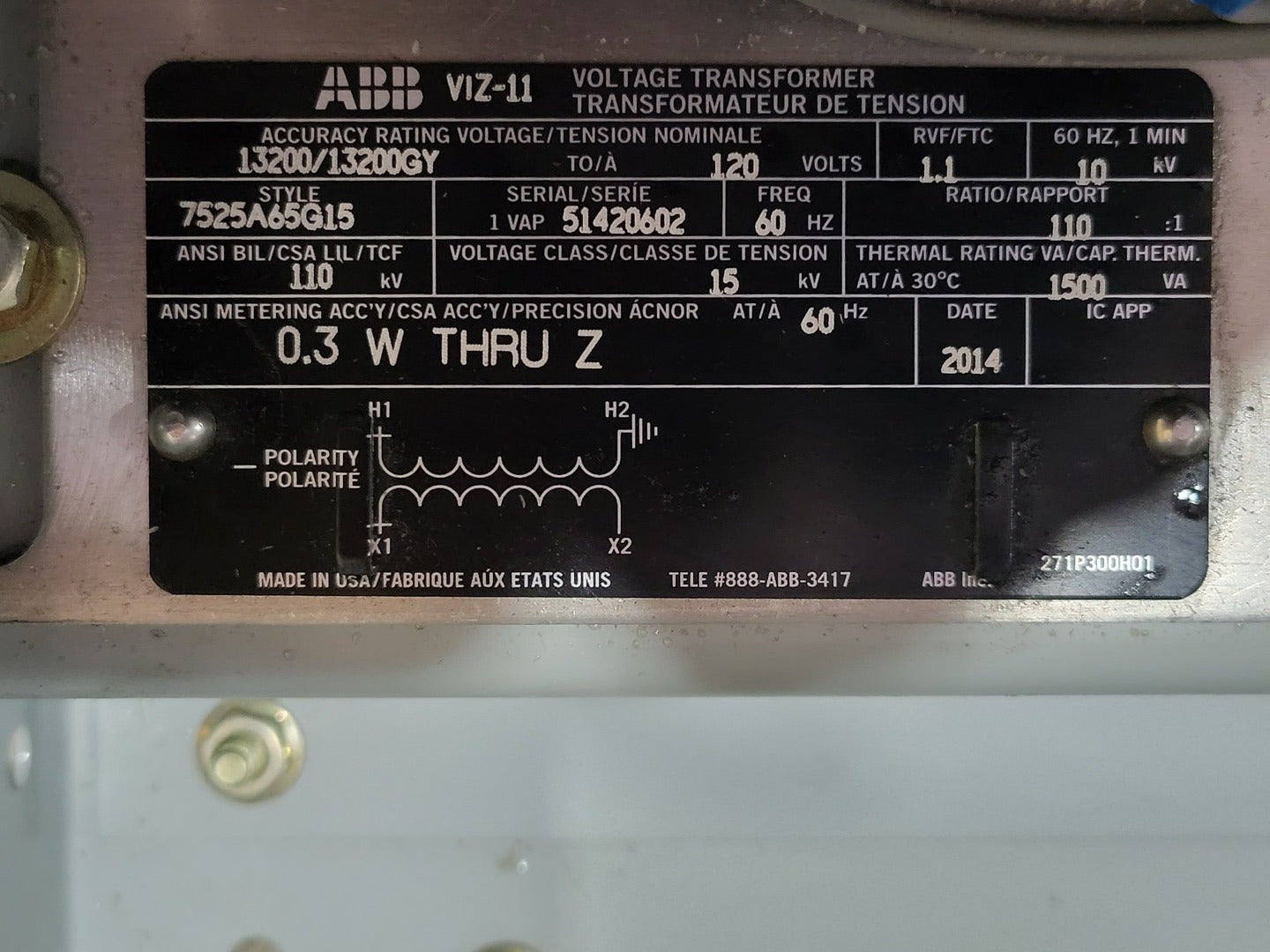 1500 VA Transformer 13200 Pri. Volts, 120 Sec. Volts 7525A65G15