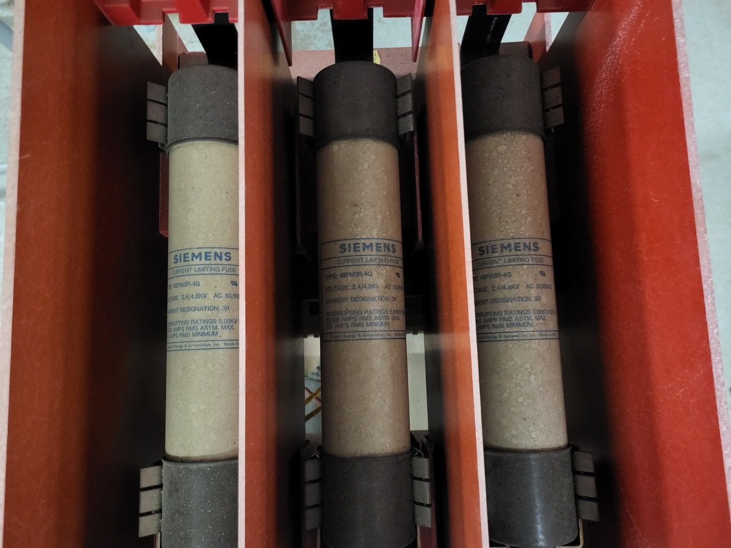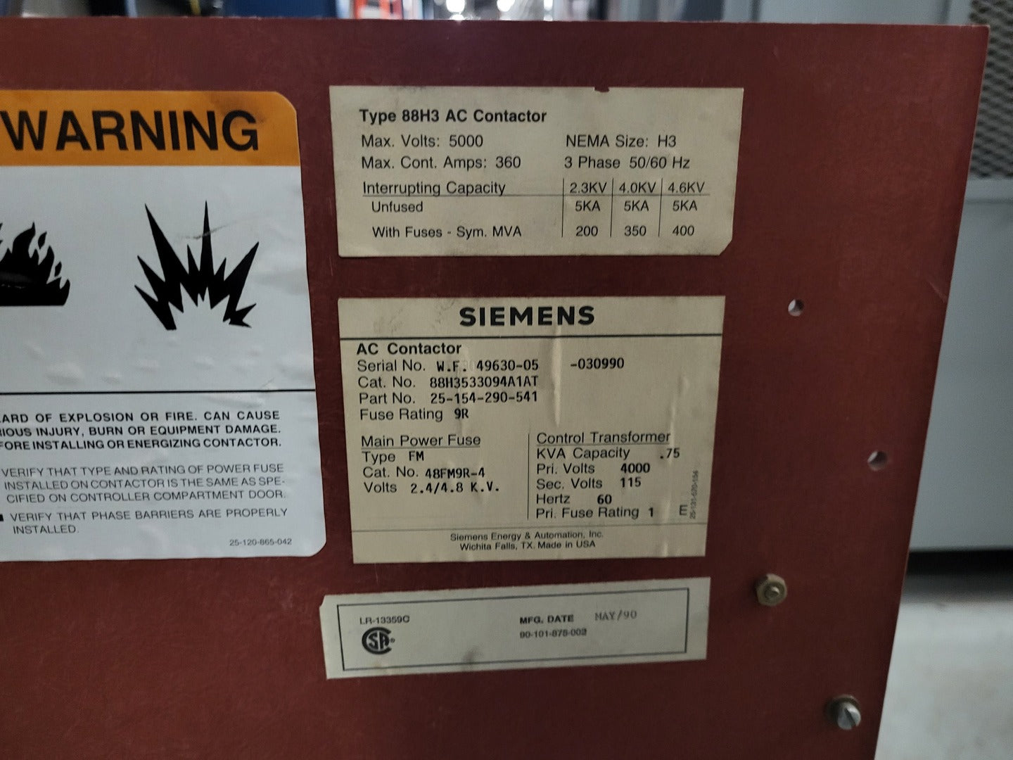 Poles: 3 Insulation Voltage: 5 kV Interruption Capacity: 350 MVA Main Fuse Rating: 9R Contactor Type: Drawout Contactor Size: NEMA 3 Phase: 3 Control Transformer:- CPT Primary Voltage: 4000 V CPT Secondary Voltage: 115 VAC CPT Capacity: 0.75 kVA CPT Primary Fuse Rating: 1.E Main Power Fuse:- Make: Siemens Model: 48FM9R-4 Type: FM Voltage Rating: 2.4/4.8 kV |