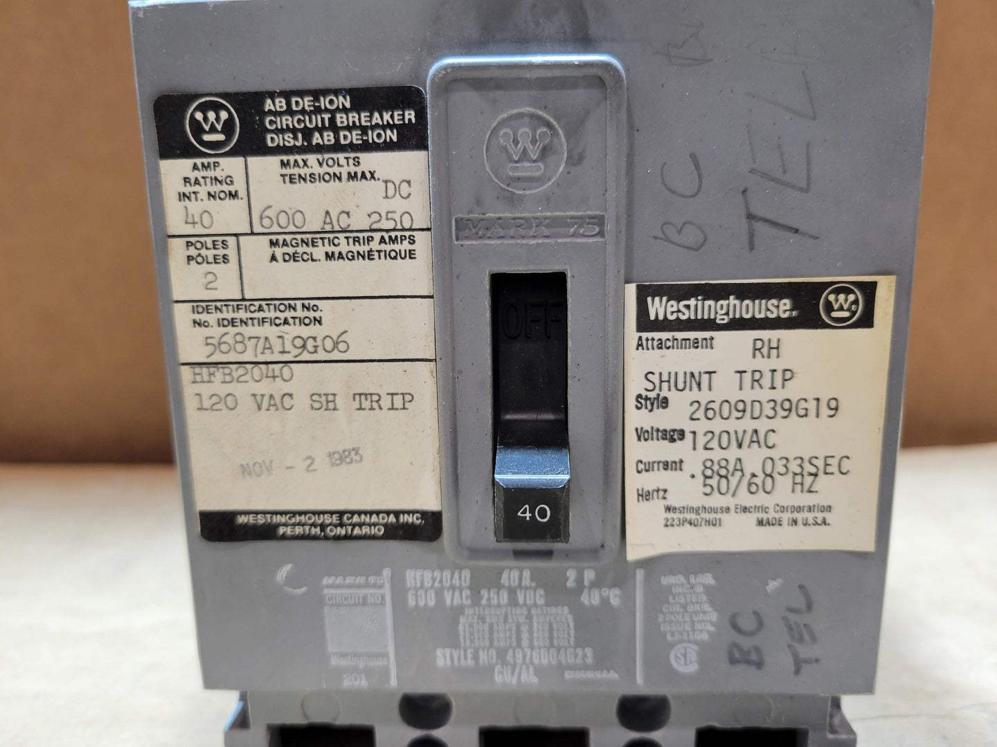 40 Amp, 2 Pole, 600 Volts Circuit Breaker HFB2040 w/ Shunt Trip