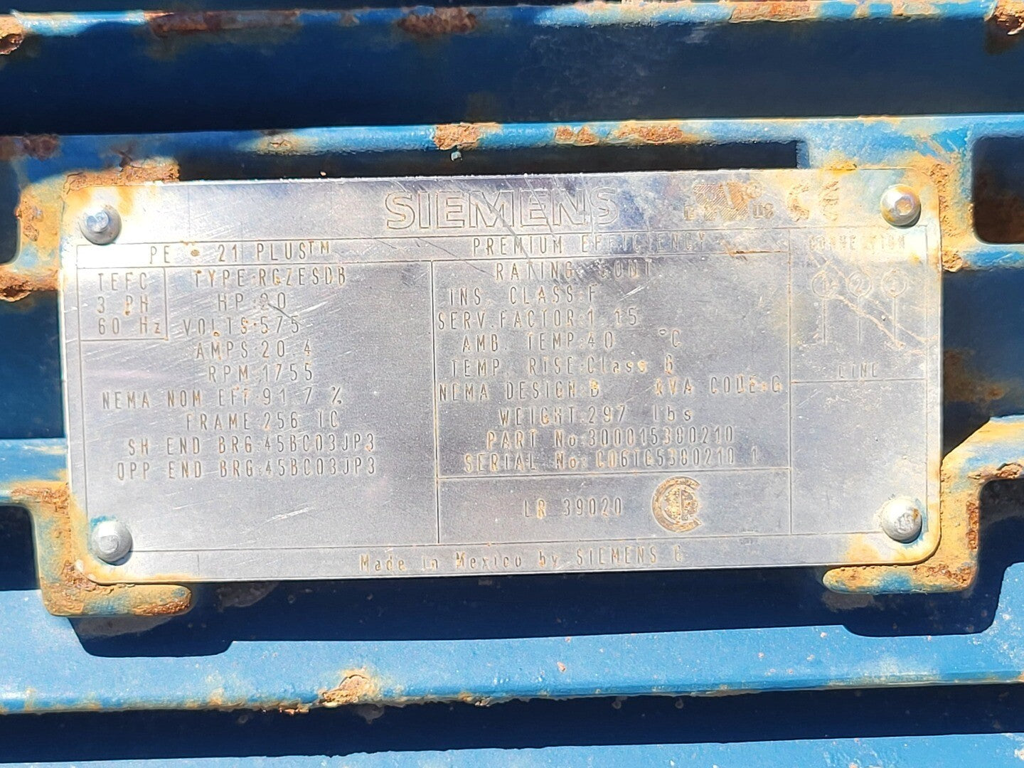Motor Type: RGZESDB S/N: C06TC5380210 Horsepower: 20 hp Amperes: 20.4 Amps RPM: 1755 Phase: 3 phase Frequency: 60 Hz Stearns Break Serial Number: 69105G010-1 Model: 1-087-082-00-gnf Torque: 105 lb-ft Mounting: Horizontal Amperes Inrush: 3.5 Amps Volts: 575/480 Volts Hertz: 60/50 hz Amperes Holding: 0.2 Amp Send pic to Jason/Will and ask where it belongs |