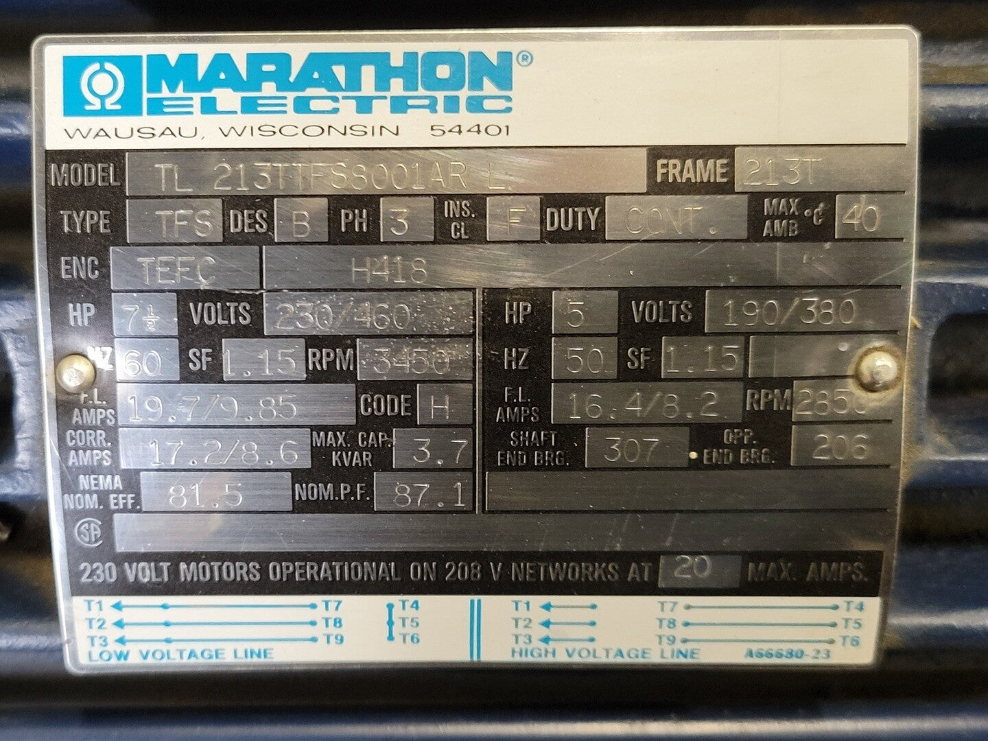 7.5hp, 230/460V, 3450rpm, 213T Electric Motor TL213TTFS8001AR L