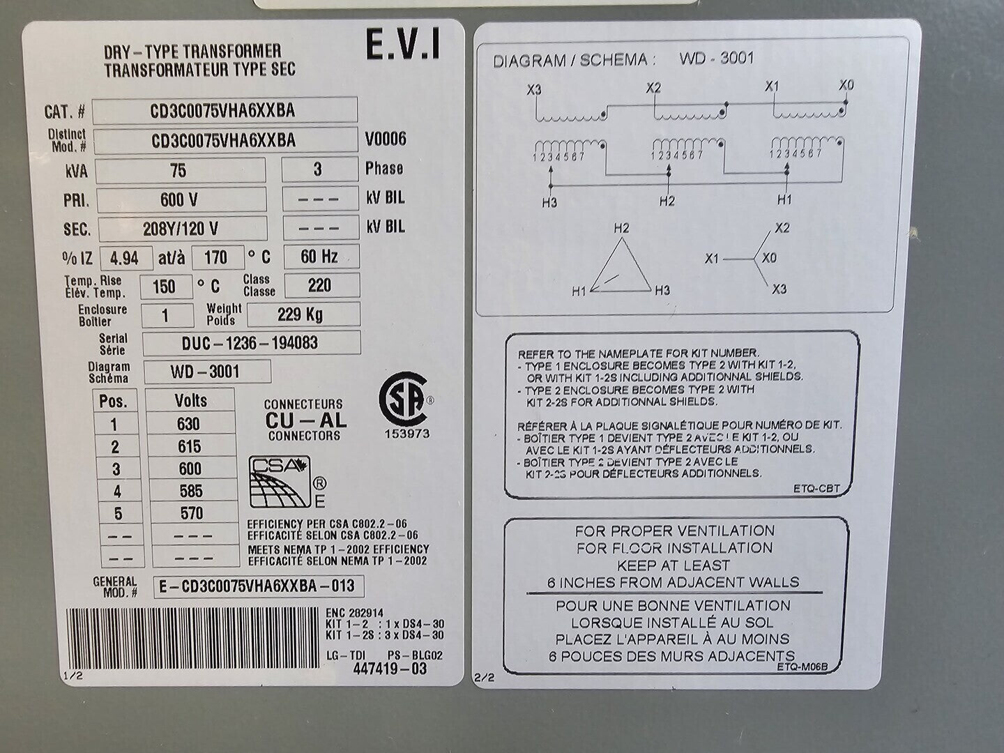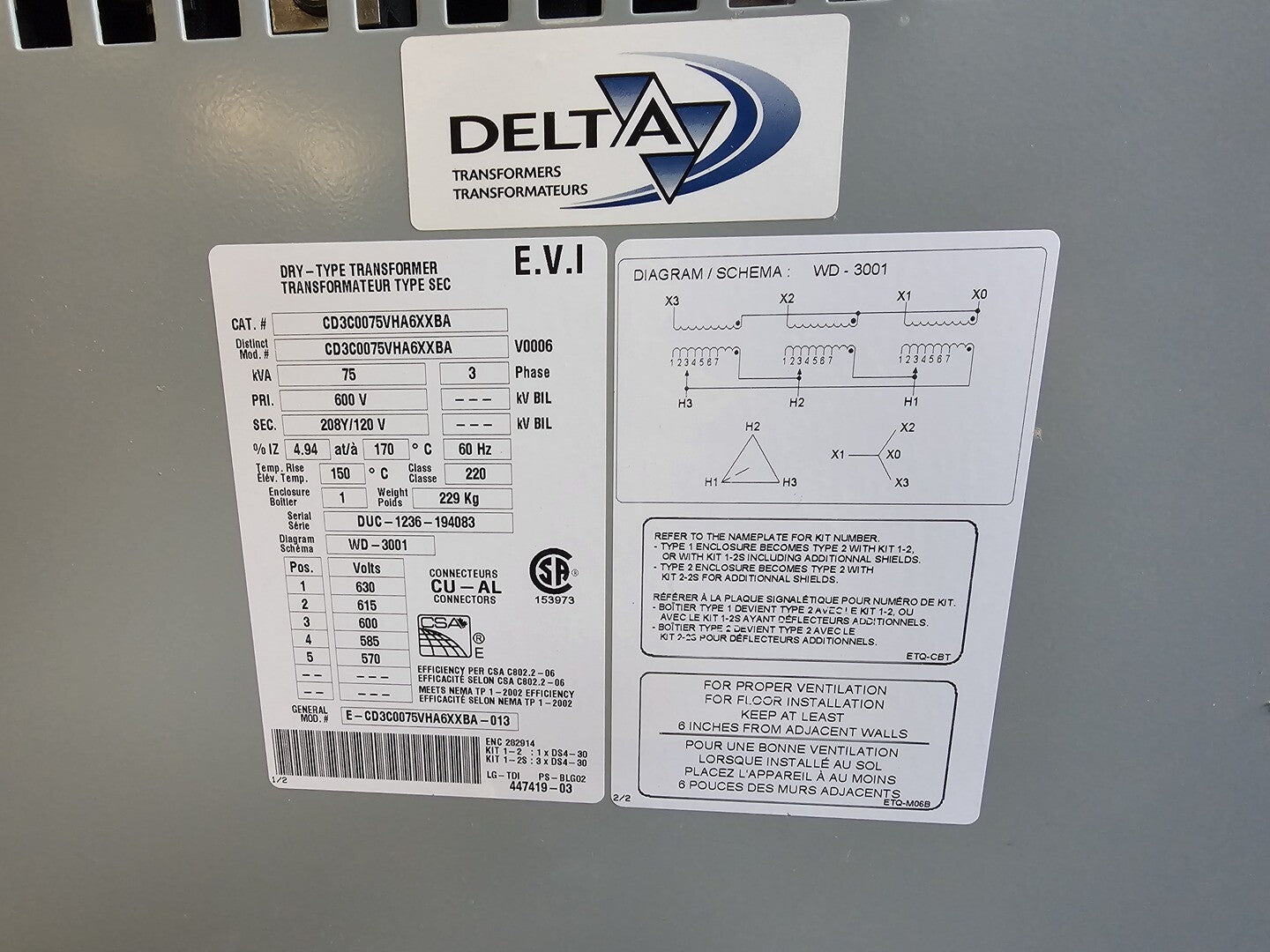 75 kVA, 600 pri. volts, 208Y/120 sec. volts Transformer CD3C0075VHA6XXBA