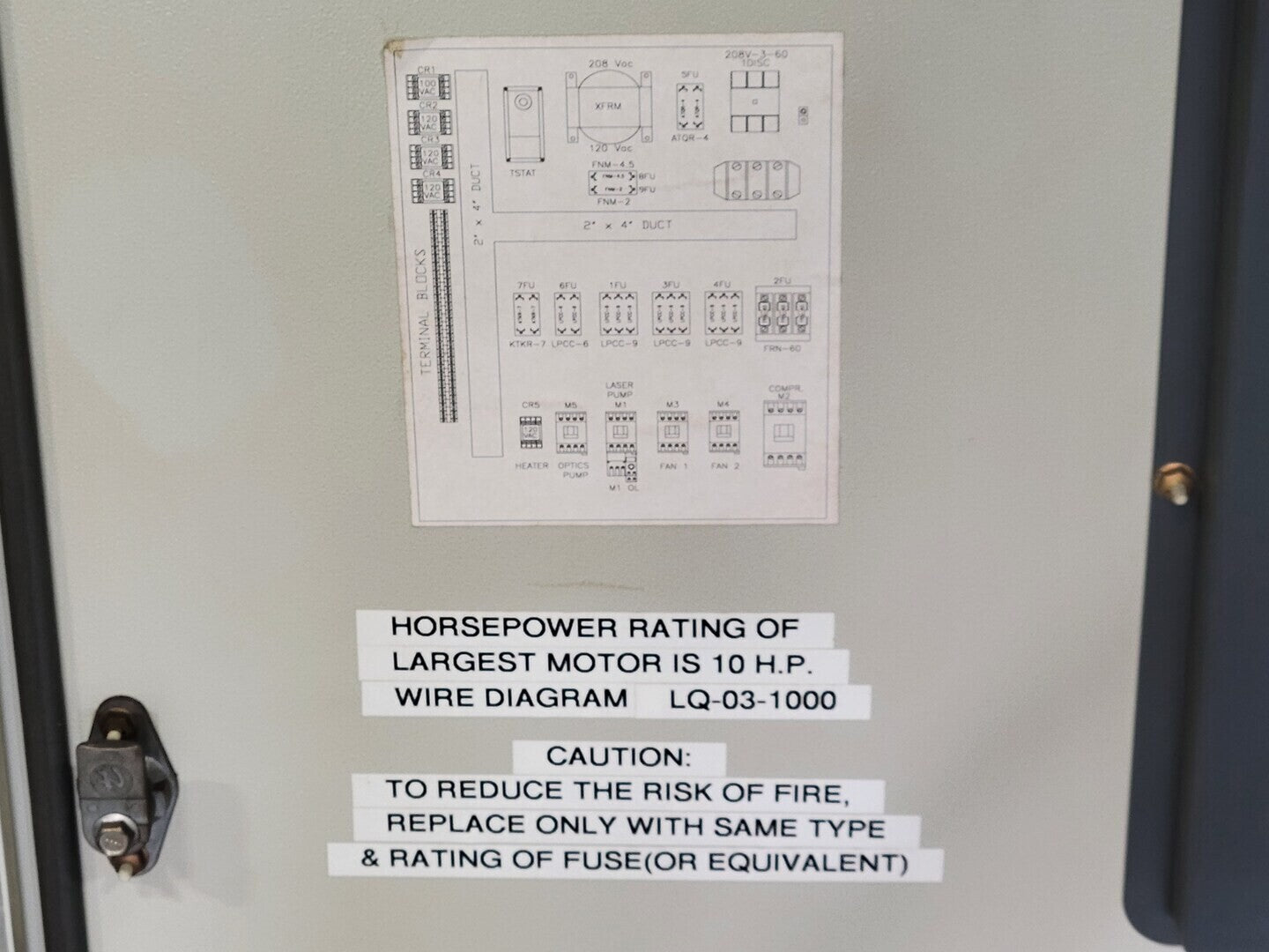 Voltage: 208 volts, 3-Phase Full load amps: 48.8 A Compressor: 10 hp Laser pump: 1.5 hp Optics pump: 0.25 hp Optics heater: 1.5 kW Min. chilled water temp: 45 F Max. chilled water temp: 60 F Refrigerant: R-22 Heat transfer fluid: Deionized water |